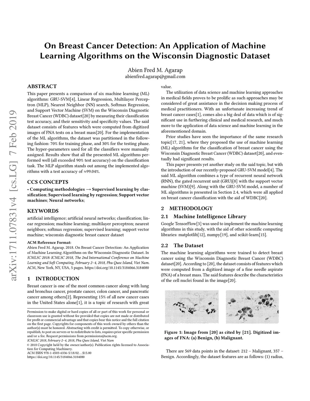 This paper presents a comparison of six machine learning (ML) algorithms: GRU-SVM (Agarap, 2017), Linear Regression, Multilayer Perceptron (MLP), Nearest Neighbor (NN) search, Softmax Regression, and Support Vector Machine (SVM) on the Wisconsin Diagnostic Breast Cancer (WDBC) dataset (Wolberg, Street, & Mangasarian, 1992) by measuring their classification test accuracy and their sensitivity and specificity values. The said dataset consists of features which were computed from digitized images of FNA tests on a breast mass (Wolberg, Street, & Mangasarian, 1992). For the implementation of the ML algorithms, the dataset was partitioned in the following fashion: 70% for training phase, and 30% for the testing phase. The hyper-parameters used for all the classifiers were manually assigned. Results show that all the presented ML algorithms performed well (all exceeded 90% test accuracy) on the classification task. The MLP algorithm stands out among the implemented algorithms with a test accuracy of ~99.04%.