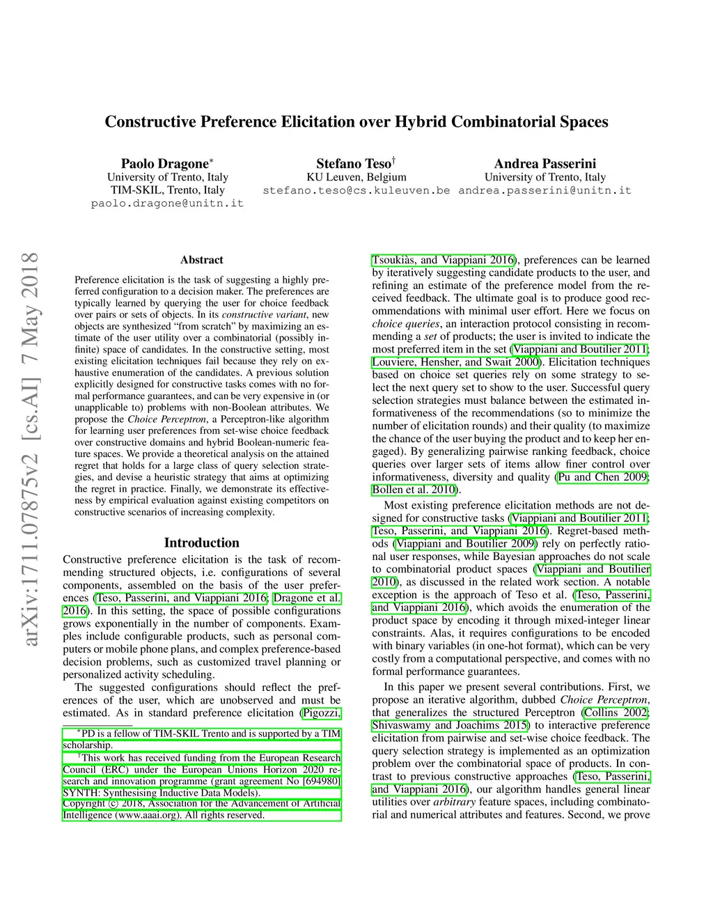 Preference elicitation is the task of suggesting a highly preferred configuration to a decision maker. The preferences are typically learned by querying the user for choice feedback over pairs or sets of objects. In its constructive variant, new objects are synthesized "from scratch" by maximizing an estimate of the user utility over a combinatorial (possibly infinite) space of candidates. In the constructive setting, most existing elicitation techniques fail because they rely on exhaustive enumeration of the candidates. A previous solution explicitly designed for constructive tasks comes with no formal performance guarantees, and can be very expensive in (or unapplicable to) problems with non-Boolean attributes. We propose the Choice Perceptron, a Perceptron-like algorithm for learning user preferences from set-wise choice feedback over constructive domains and hybrid Boolean-numeric feature spaces. We provide a theoretical analysis on the attained regret that holds for a large class of query selection strategies, and devise a heuristic strategy that aims at optimizing the regret in practice. Finally, we demonstrate its effectiveness by empirical evaluation against existing competitors on constructive scenarios of increasing complexity.