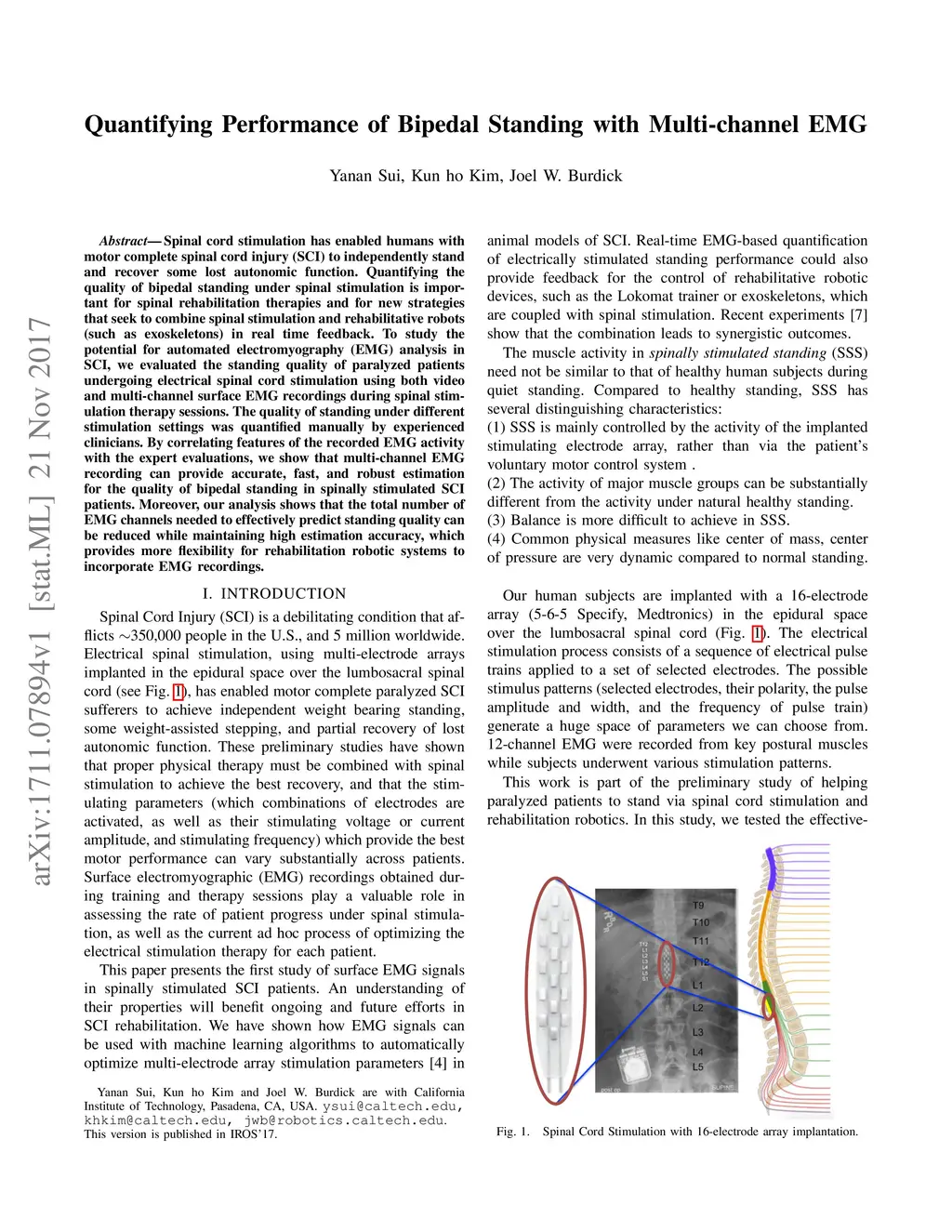 Spinal cord stimulation has enabled humans with motor complete spinal cord injury (SCI) to independently stand and recover some lost autonomic function. Quantifying the quality of bipedal standing under spinal stimulation is important for spinal rehabilitation therapies and for new strategies that seek to combine spinal stimulation and rehabilitative robots (such as exoskeletons) in real time feedback. To study the potential for automated electromyography (EMG) analysis in SCI, we evaluated the standing quality of paralyzed patients undergoing electrical spinal cord stimulation using both video and multi-channel surface EMG recordings during spinal stimulation therapy sessions. The quality of standing under different stimulation settings was quantified manually by experienced clinicians. By correlating features of the recorded EMG activity with the expert evaluations, we show that multi-channel EMG recording can provide accurate, fast, and robust estimation for the quality of bipedal standing in spinally stimulated SCI patients. Moreover, our analysis shows that the total number of EMG channels needed to effectively predict standing quality can be reduced while maintaining high estimation accuracy, which provides more flexibility for rehabilitation robotic systems to incorporate EMG recordings.