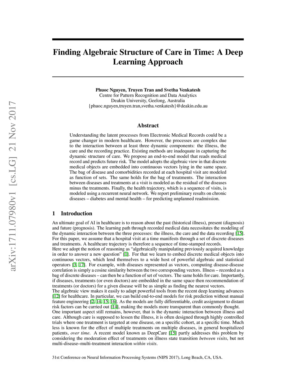 Understanding the latent processes from Electronic Medical Records could be a game changer in modern healthcare. However, the processes are complex due to the interaction between at least three dynamic components: the illness, the care and the recording practice. Existing methods are inadequate in capturing the dynamic structure of care. We propose an end-to-end model that reads medical record and predicts future risk. The model adopts the algebraic view in that discrete medical objects are embedded into continuous vectors lying in the same space. The bag of disease and comorbidities recorded at each hospital visit are modeled as function of sets. The same holds for the bag of treatments. The interaction between diseases and treatments at a visit is modeled as the residual of the diseases minus the treatments. Finally, the health trajectory, which is a sequence of visits, is modeled using a recurrent neural network. We report preliminary results on chronic diseases - diabetes and mental health - for predicting unplanned readmission.