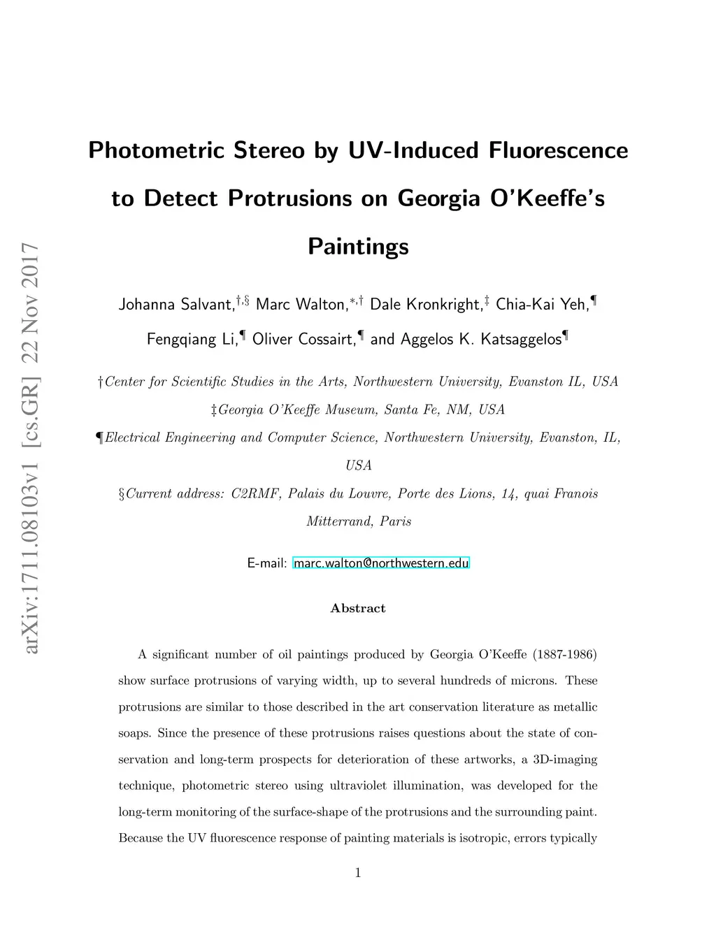 A significant number of oil paintings produced by Georgia O'Keeffe (1887-1986) show surface protrusions of varying width, up to several hundreds of microns. These protrusions are similar to those described in the art conservation literature as metallic soaps. Since the presence of these protrusions raises questions about the state of conservation and long-term prospects for deterioration of these artworks, a 3D-imaging technique, photometric stereo using ultraviolet illumination, was developed for the long-term monitoring of the surface-shape of the protrusions and the surrounding paint. Because the UV fluorescence response of painting materials is isotropic, errors typically caused by non-Lambertian (anisotropic) specularities when using visible reflected light can be avoided providing a more accurate estimation of shape. As an added benefit, fluorescence provides additional contrast information contributing to materials characterization. The developed methodology aims to detect, characterize, and quantify the distribution of micro-protrusions and their development over the surface of entire artworks. Combined with a set of analytical in-situ techniques, and computational tools, this approach constitutes a novel methodology to investigate the selective distribution of protrusions in correlation with the composition of painting materials at the macro-scale. While focused on O'Keeffe's paintings as a case study, we expect the proposed approach to have broader significance by providing a non-invasive protocol to the conservation community to probe topological changes for any relatively flat painted surface of an artwork, and more specifically to monitor the dynamic formation of protrusions, in relation to paint composition and modifications of environmental conditions, loans, exhibitions and storage over the long-term.
