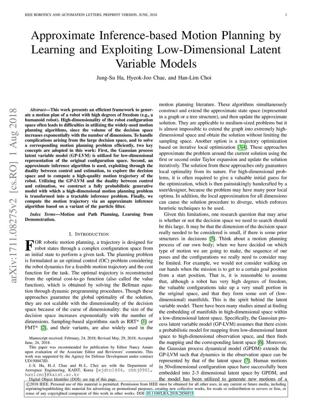 This work presents an efficient framework to generate a motion plan of a robot with high degrees of freedom (e.g., a humanoid robot). High-dimensionality of the robot configuration space often leads to difficulties in utilizing the widely-used motion planning algorithms, since the volume of the decision space increases exponentially with the number of dimensions. To handle complications arising from the large decision space, and to solve a corresponding motion planning problem efficiently, two key concepts are adopted in this work: First, the Gaussian process latent variable model (GP-LVM) is utilized for low-dimensional representation of the original configuration space. Second, an approximate inference algorithm is used, exploiting through the duality between control and estimation, to explore the decision space and to compute a high-quality motion trajectory of the robot. Utilizing the GP-LVM and the duality between control and estimation, we construct a fully probabilistic generative model with which a high-dimensional motion planning problem is transformed into a tractable inference problem. Finally, we compute the motion trajectory via an approximate inference algorithm based on a variant of the particle filter. The resulting motions can be viewed in the supplemental video. ( https://youtu.be/kngEaOR4Esc )