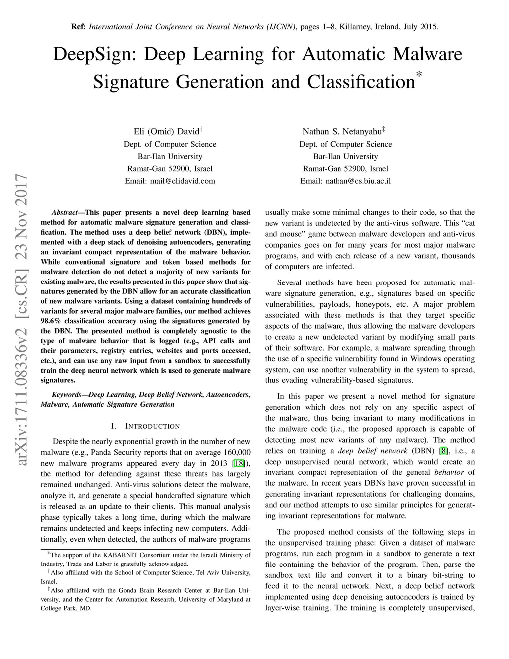 DeepSign: Deep Learning for Automatic Malware Signature Generation and