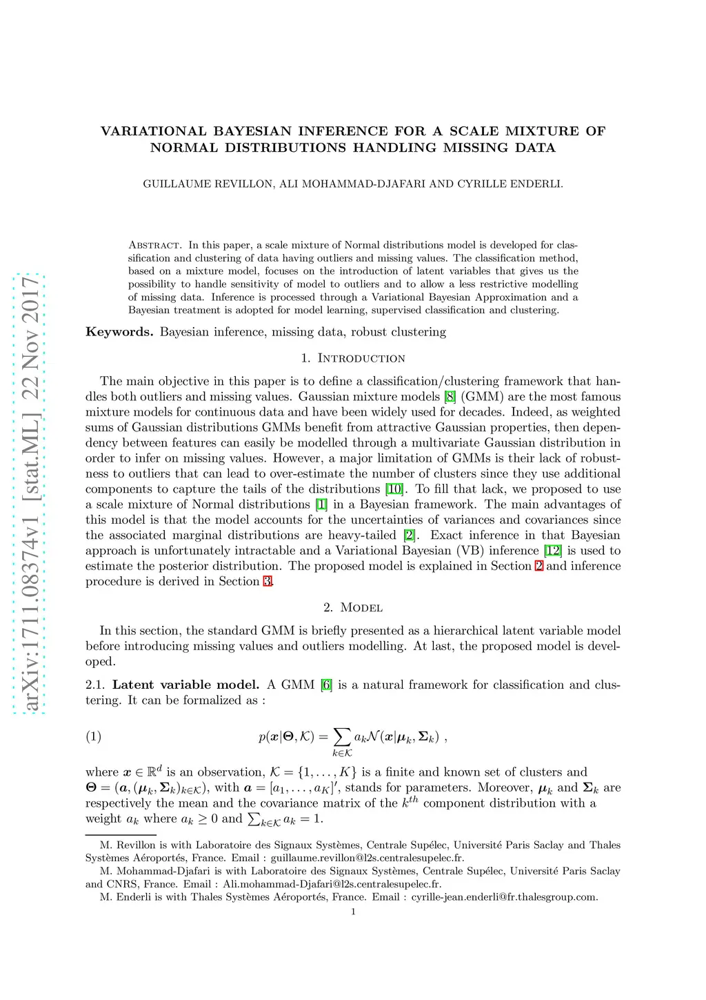 In this paper, a scale mixture of Normal distributions model is developed for classification and clustering of data having outliers and missing values. The classification method, based on a mixture model, focuses on the introduction of latent variables that gives us the possibility to handle sensitivity of model to outliers and to allow a less restrictive modelling of missing data. Inference is processed through a Variational Bayesian Approximation and a Bayesian treatment is adopted for model learning, supervised classification and clustering.