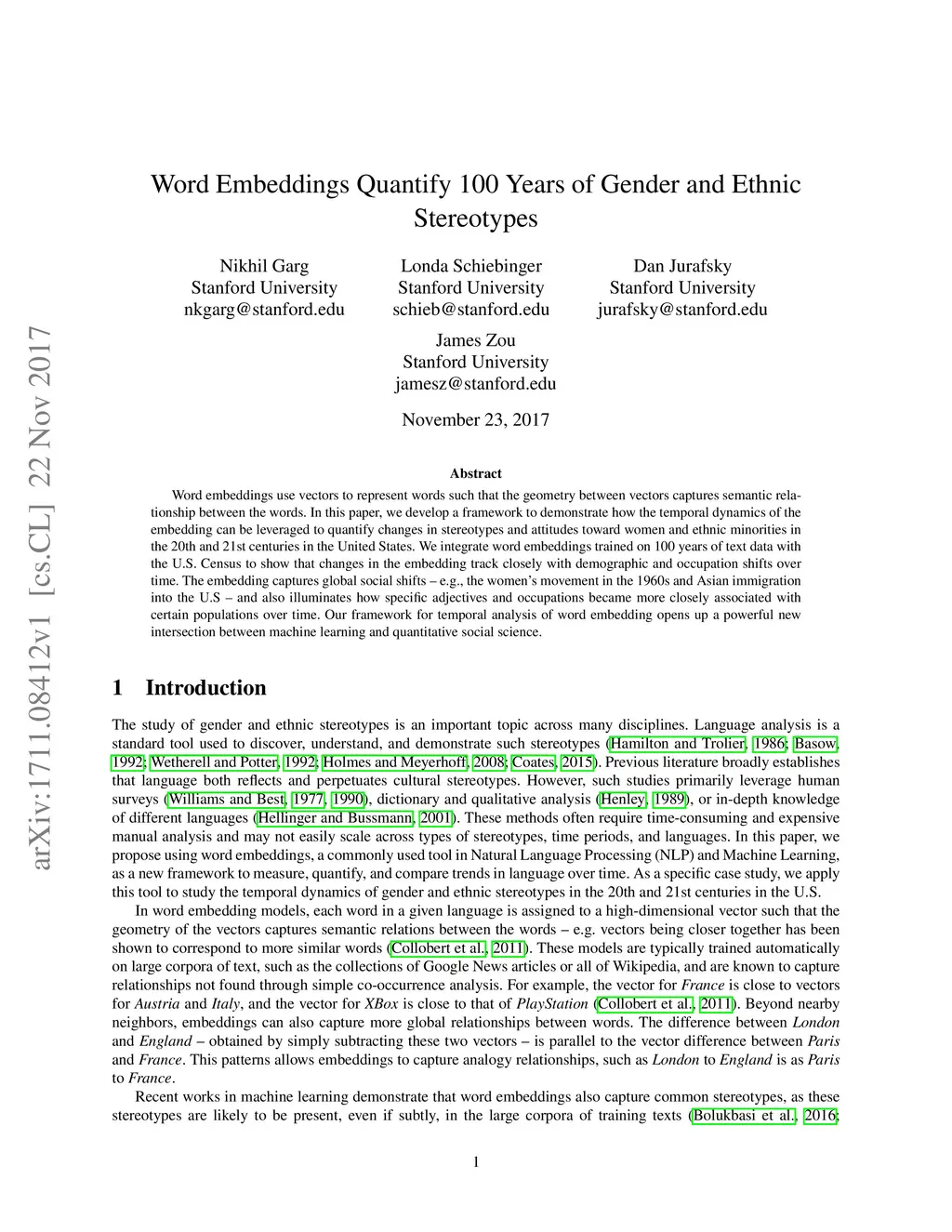 Word Embeddings Quantify 100 Years of Gender and Ethnic Stereotypes