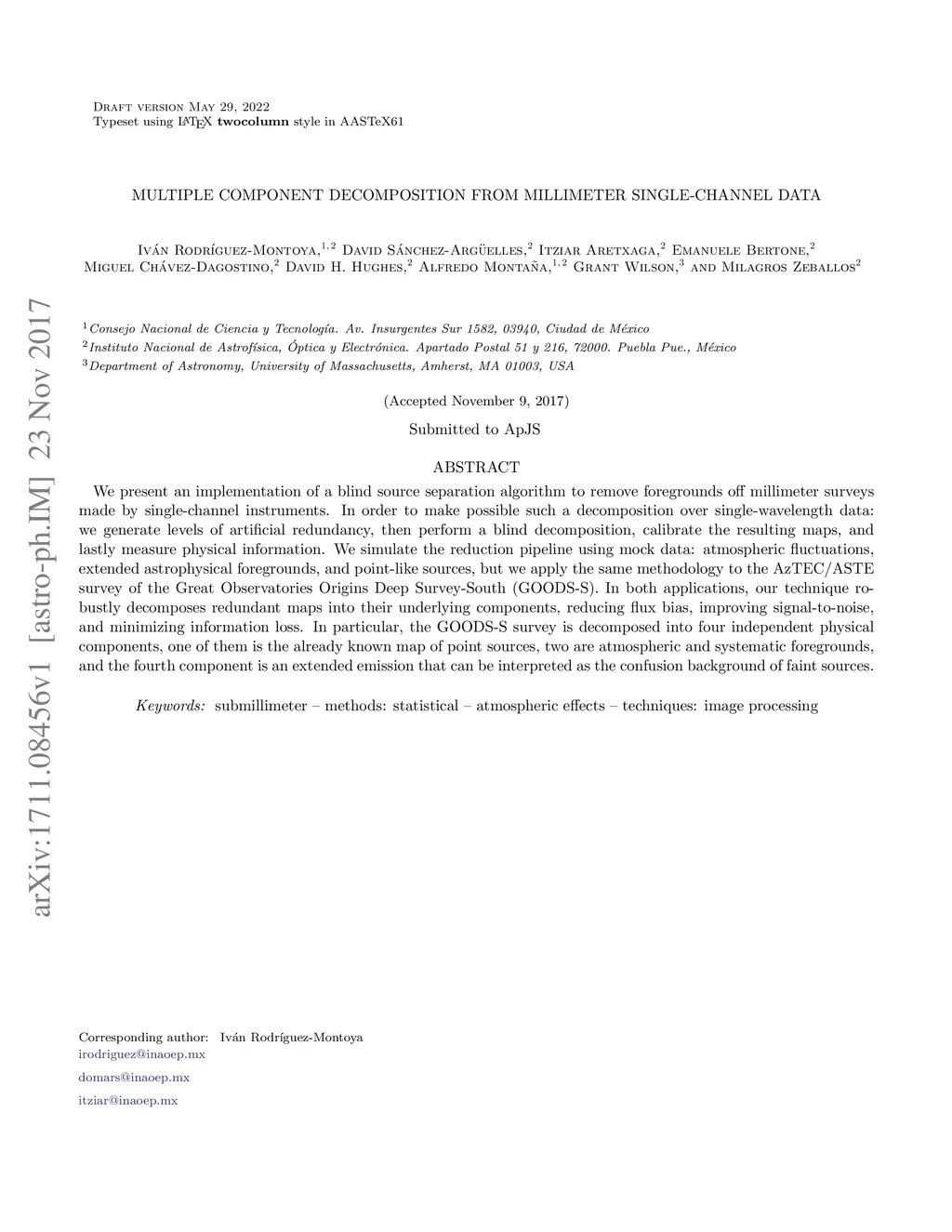 We present an implementation of a blind source separation algorithm to remove foregrounds off millimeter surveys made by single-channel instruments. In order to make possible such a decomposition over single-wavelength data: we generate levels of artificial redundancy, then perform a blind decomposition, calibrate the resulting maps, and lastly measure physical information. We simulate the reduction pipeline using mock data: atmospheric fluctuations, extended astrophysical foregrounds, and point-like sources, but we apply the same methodology to the AzTEC/ASTE survey of the Great Observatories Origins Deep Survey-South (GOODS-S). In both applications, our technique robustly decomposes redundant maps into their underlying components, reducing flux bias, improving signal-to-noise, and minimizing information loss. In particular, the GOODS-S survey is decomposed into four independent physical components, one of them is the already known map of point sources, two are atmospheric and systematic foregrounds, and the fourth component is an extended emission that can be interpreted as the confusion background of faint sources.