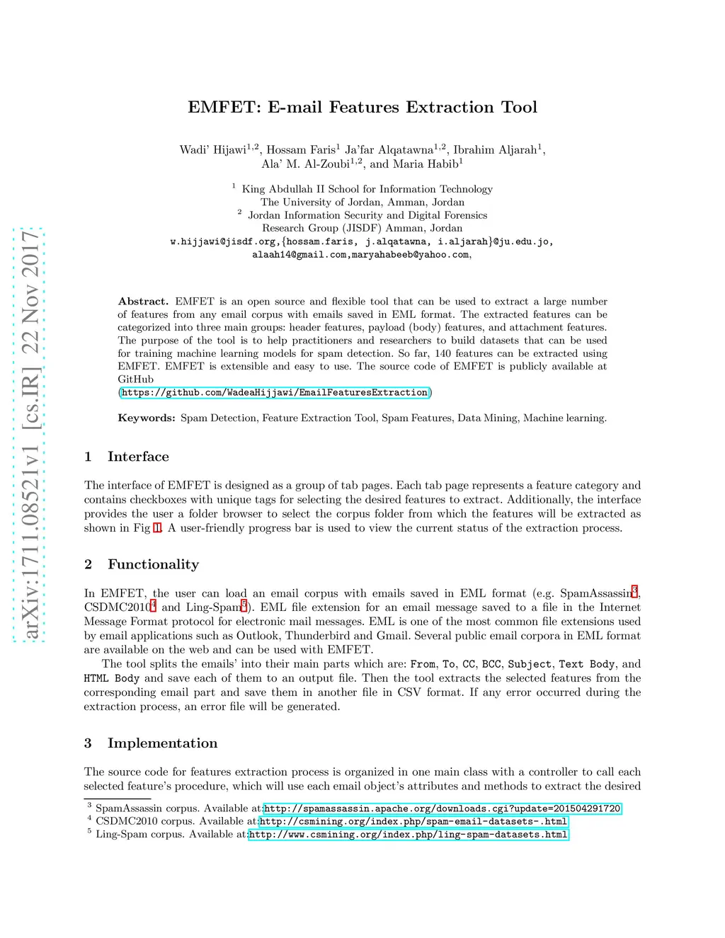 EMFET is an open source and flexible tool that can be used to extract a large number of features from any email corpus with emails saved in EML format. The extracted features can be categorized into three main groups: header features, payload (body) features, and attachment features. The purpose of the tool is to help practitioners and researchers to build datasets that can be used for training machine learning models for spam detection. So far, 140 features can be extracted using EMFET. EMFET is extensible and easy to use. The source code of EMFET is publicly available at GitHub (https://github.com/WadeaHijjawi/EmailFeaturesExtraction)