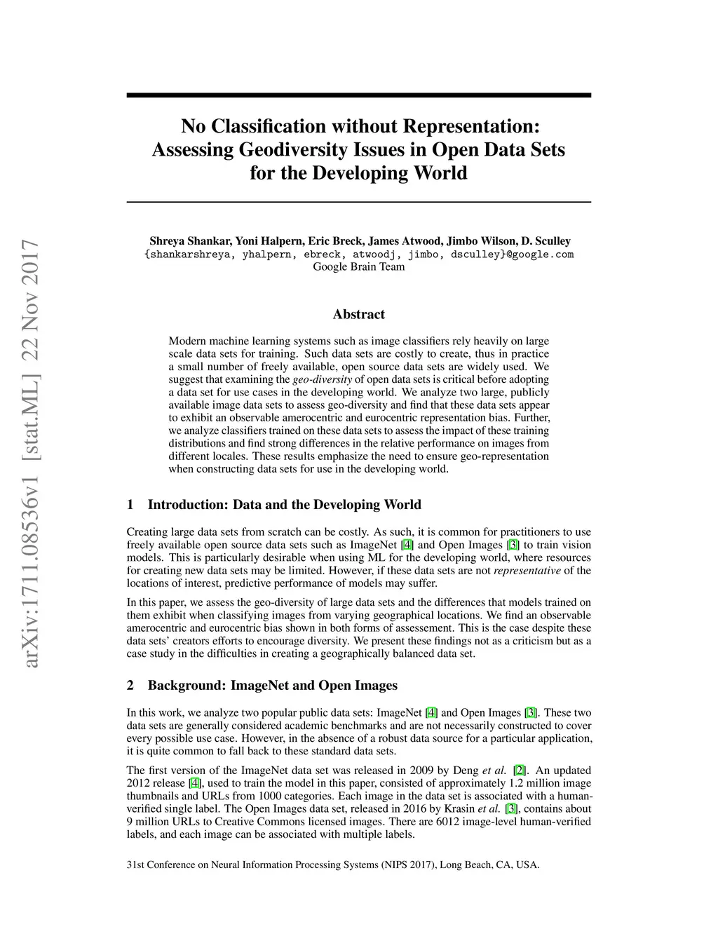 Modern machine learning systems such as image classifiers rely heavily on large scale data sets for training. Such data sets are costly to create, thus in practice a small number of freely available, open source data sets are widely used. We suggest that examining the geo-diversity of open data sets is critical before adopting a data set for use cases in the developing world. We analyze two large, publicly available image data sets to assess geo-diversity and find that these data sets appear to exhibit an observable amerocentric and eurocentric representation bias. Further, we analyze classifiers trained on these data sets to assess the impact of these training distributions and find strong differences in the relative performance on images from different locales. These results emphasize the need to ensure geo-representation when constructing data sets for use in the developing world.