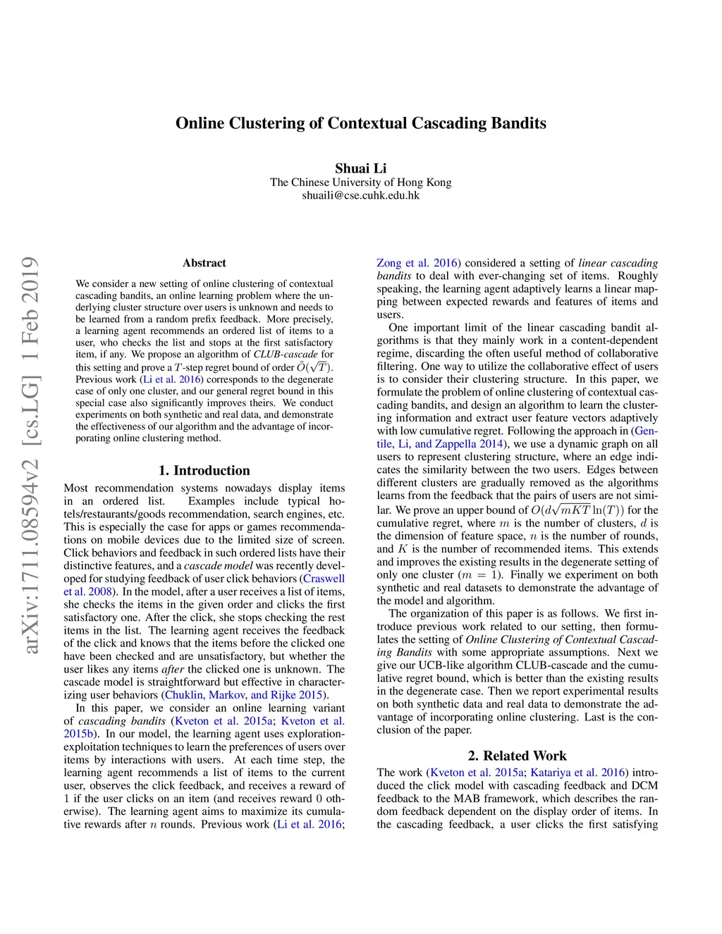 We consider a new setting of online clustering of contextual cascading bandits, an online learning problem where the underlying cluster structure over users is unknown and needs to be learned from a random prefix feedback. More precisely, a learning agent recommends an ordered list of items to a user, who checks the list and stops at the first satisfactory item, if any. We propose an algorithm of CLUB-cascade for this setting and prove a -step regret bound of order . Previous work corresponds to the degenerate case of only one cluster, and our general regret bound in this special case also significantly improves theirs. We conduct experiments on both synthetic and real data, and demonstrate the effectiveness of our algorithm and the advantage of incorporating online clustering method.