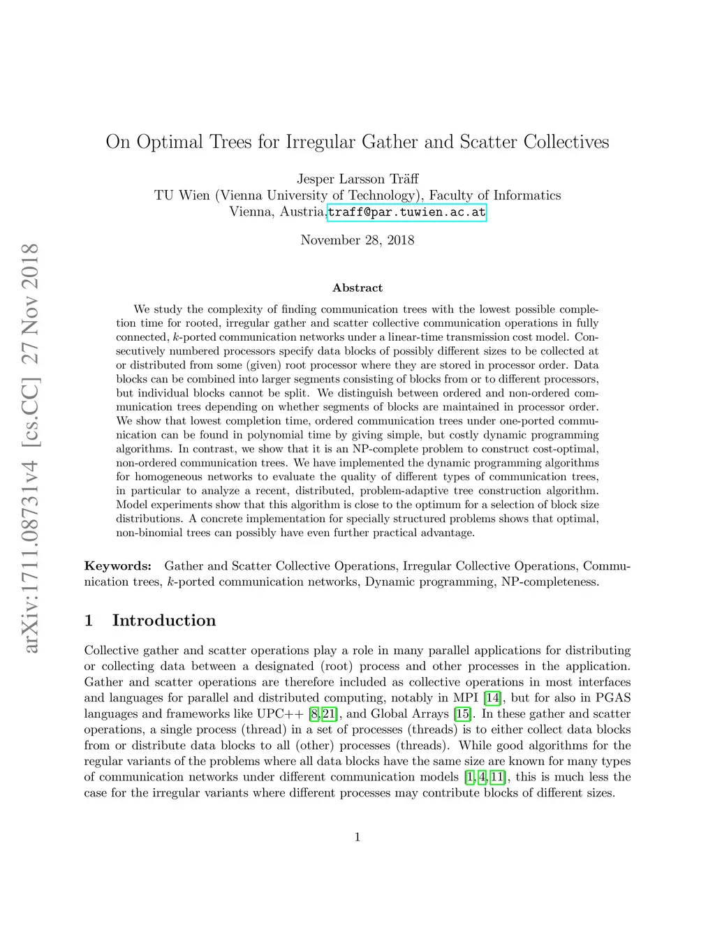 We study the complexity of finding communication trees with the lowest possible completion time for rooted, irregular gather and scatter collective communication operations in fully connected, -ported communication networks under a linear-time transmission cost model. Consecutively numbered processors specify data blocks of possibly different sizes to be collected at or distributed from some (given) root processor where they are stored in processor order. Data blocks can be combined into larger segments consisting of blocks from or to different processors, but individual blocks cannot be split. We distinguish between ordered and non-ordered communication trees depending on whether segments of blocks are maintained in processor order. We show that lowest completion time, ordered communication trees under one-ported communication can be found in polynomial time by giving simple, but costly dynamic programming algorithms. In contrast, we show that it is an NP-complete problem to construct cost-optimal, non-ordered communication trees. We have implemented the dynamic programming algorithms for homogeneous networks to evaluate the quality of different types of communication trees, in particular to analyze a recent, distributed, problem-adaptive tree construction algorithm. Model experiments show that this algorithm is close to the optimum for a selection of block size distributions. A concrete implementation for specially structured problems shows that optimal, non-binomial trees can possibly have even further practical advantage.
