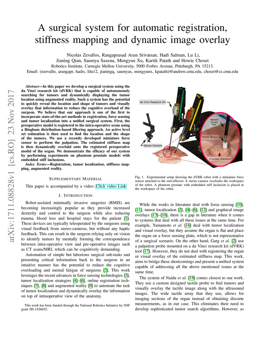In this paper we develop a surgical system using the da Vinci research kit (dVRK) that is capable of autonomously searching for tumors and dynamically displaying the tumor location using augmented reality. Such a system has the potential to quickly reveal the location and shape of tumors and visually overlay that information to reduce the cognitive overload of the surgeon. We believe that our approach is one of the first to incorporate state-of-the-art methods in registration, force sensing and tumor localization into a unified surgical system. First, the preoperative model is registered to the intra-operative scene using a Bingham distribution-based filtering approach. An active level set estimation is then used to find the location and the shape of the tumors. We use a recently developed miniature force sensor to perform the palpation. The estimated stiffness map is then dynamically overlaid onto the registered preoperative model of the organ. We demonstrate the efficacy of our system by performing experiments on phantom prostate models with embedded stiff inclusions.