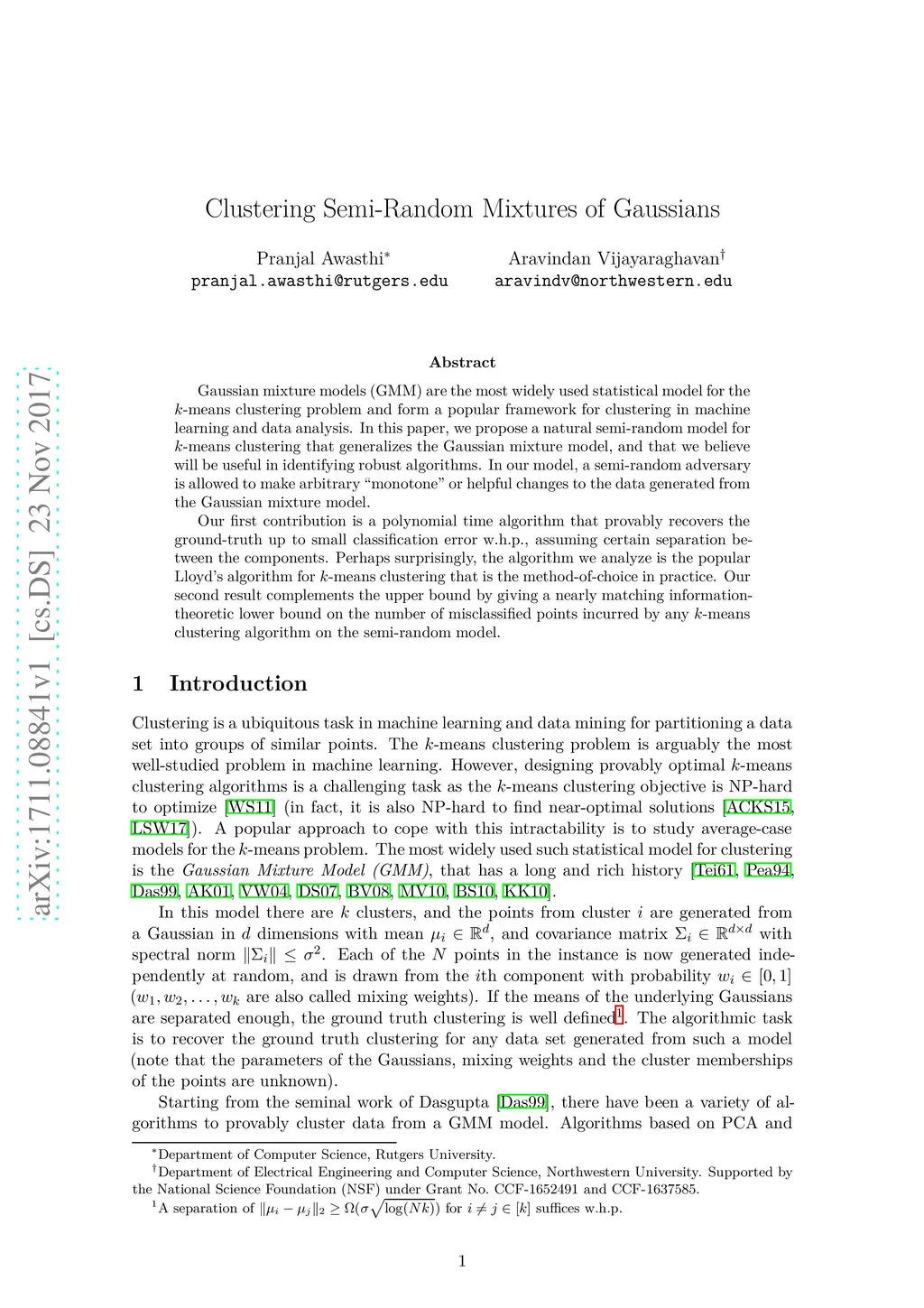 Gaussian mixture models (GMM) are the most widely used statistical model for the -means clustering problem and form a popular framework for clustering in machine learning and data analysis. In this paper, we propose a natural semi-random model for -means clustering that generalizes the Gaussian mixture model, and that we believe will be useful in identifying robust algorithms. In our model, a semi-random adversary is allowed to make arbitrary "monotone" or helpful changes to the data generated from the Gaussian mixture model. Our first contribution is a polynomial time algorithm that provably recovers the ground-truth up to small classification error w.h.p., assuming certain separation between the components. Perhaps surprisingly, the algorithm we analyze is the popular Lloyd's algorithm for -means clustering that is the method-of-choice in practice. Our second result complements the upper bound by giving a nearly matching information-theoretic lower bound on the number of misclassified points incurred by any -means clustering algorithm on the semi-random model.