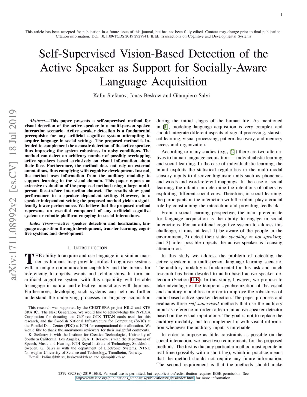 Self-Supervised Vision-Based Detection of the Active Speaker as Support
