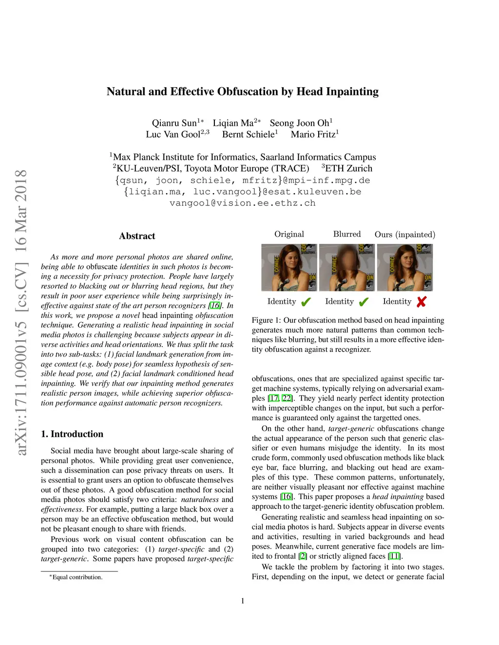 As more and more personal photos are shared online, being able to obfuscate identities in such photos is becoming a necessity for privacy protection. People have largely resorted to blacking out or blurring head regions, but they result in poor user experience while being surprisingly ineffective against state of the art person recognizers. In this work, we propose a novel head inpainting obfuscation technique. Generating a realistic head inpainting in social media photos is challenging because subjects appear in diverse activities and head orientations. We thus split the task into two sub-tasks: (1) facial landmark generation from image context (e.g. body pose) for seamless hypothesis of sensible head pose, and (2) facial landmark conditioned head inpainting. We verify that our inpainting method generates realistic person images, while achieving superior obfuscation performance against automatic person recognizers.