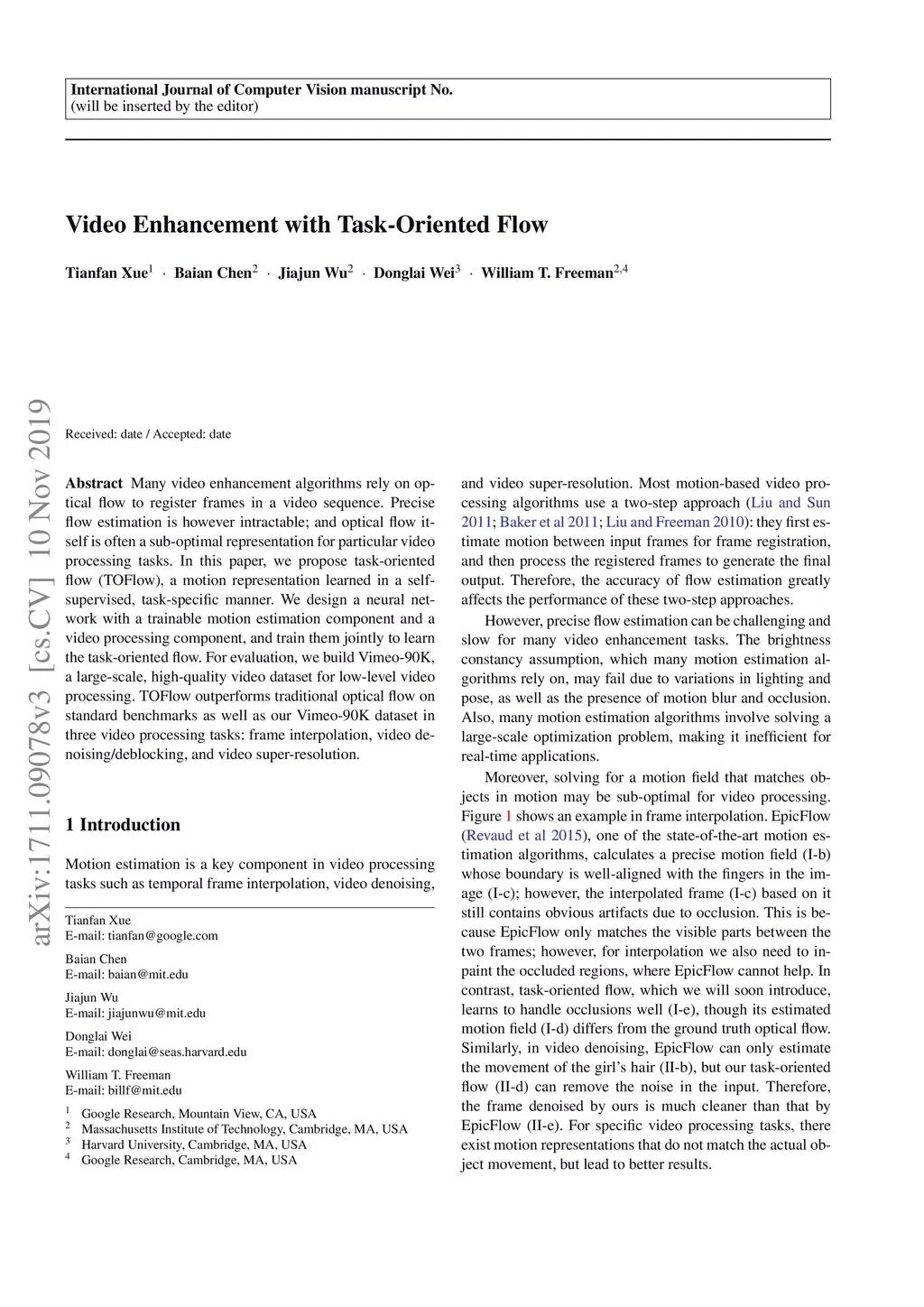 Many video enhancement algorithms rely on optical flow to register frames in a video sequence. Precise flow estimation is however intractable; and optical flow itself is often a sub-optimal representation for particular video processing tasks. In this paper, we propose task-oriented flow (TOFlow), a motion representation learned in a self-supervised, task-specific manner. We design a neural network with a trainable motion estimation component and a video processing component, and train them jointly to learn the task-oriented flow. For evaluation, we build Vimeo-90K, a large-scale, high-quality video dataset for low-level video processing. TOFlow outperforms traditional optical flow on standard benchmarks as well as our Vimeo-90K dataset in three video processing tasks: frame interpolation, video denoising/deblocking, and video super-resolution.