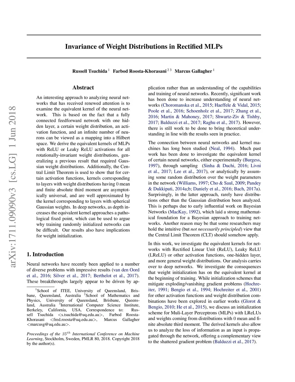 An interesting approach to analyzing neural networks that has received renewed attention is to examine the equivalent kernel of the neural network. This is based on the fact that a fully connected feedforward network with one hidden layer, a certain weight distribution, an activation function, and an infinite number of neurons can be viewed as a mapping into a Hilbert space. We derive the equivalent kernels of MLPs with ReLU or Leaky ReLU activations for all rotationally-invariant weight distributions, generalizing a previous result that required Gaussian weight distributions. Additionally, the Central Limit Theorem is used to show that for certain activation functions, kernels corresponding to layers with weight distributions having mean and finite absolute third moment are asymptotically universal, and are well approximated by the kernel corresponding to layers with spherical Gaussian weights. In deep networks, as depth increases the equivalent kernel approaches a pathological fixed point, which can be used to argue why training randomly initialized networks can be difficult. Our results also have implications for weight initialization.