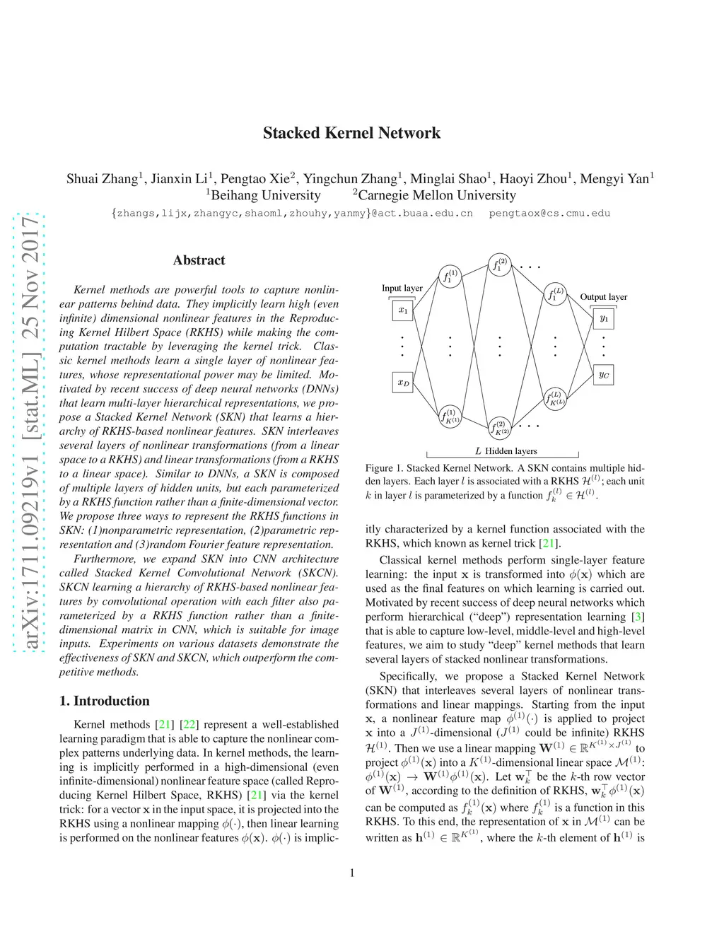 Kernel methods are powerful tools to capture nonlinear patterns behind data. They implicitly learn high (even infinite) dimensional nonlinear features in the Reproducing Kernel Hilbert Space (RKHS) while making the computation tractable by leveraging the kernel trick. Classic kernel methods learn a single layer of nonlinear features, whose representational power may be limited. Motivated by recent success of deep neural networks (DNNs) that learn multi-layer hierarchical representations, we propose a Stacked Kernel Network (SKN) that learns a hierarchy of RKHS-based nonlinear features. SKN interleaves several layers of nonlinear transformations (from a linear space to a RKHS) and linear transformations (from a RKHS to a linear space). Similar to DNNs, a SKN is composed of multiple layers of hidden units, but each parameterized by a RKHS function rather than a finite-dimensional vector. We propose three ways to represent the RKHS functions in SKN: (1)nonparametric representation, (2)parametric representation and (3)random Fourier feature representation. Furthermore, we expand SKN into CNN architecture called Stacked Kernel Convolutional Network (SKCN). SKCN learning a hierarchy of RKHS-based nonlinear features by convolutional operation with each filter also parameterized by a RKHS function rather than a finite-dimensional matrix in CNN, which is suitable for image inputs. Experiments on various datasets demonstrate the effectiveness of SKN and SKCN, which outperform the competitive methods.