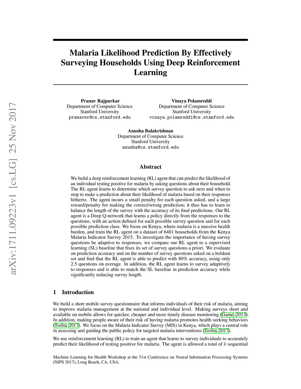 We build a deep reinforcement learning (RL) agent that can predict the likelihood of an individual testing positive for malaria by asking questions about their household. The RL agent learns to determine which survey question to ask next and when to stop to make a prediction about their likelihood of malaria based on their responses hitherto. The agent incurs a small penalty for each question asked, and a large reward/penalty for making the correct/wrong prediction; it thus has to learn to balance the length of the survey with the accuracy of its final predictions. Our RL agent is a Deep Q-network that learns a policy directly from the responses to the questions, with an action defined for each possible survey question and for each possible prediction class. We focus on Kenya, where malaria is a massive health burden, and train the RL agent on a dataset of 6481 households from the Kenya Malaria Indicator Survey 2015. To investigate the importance of having survey questions be adaptive to responses, we compare our RL agent to a supervised learning (SL) baseline that fixes its set of survey questions a priori. We evaluate on prediction accuracy and on the number of survey questions asked on a holdout set and find that the RL agent is able to predict with 80% accuracy, using only 2.5 questions on average. In addition, the RL agent learns to survey adaptively to responses and is able to match the SL baseline in prediction accuracy while significantly reducing survey length.