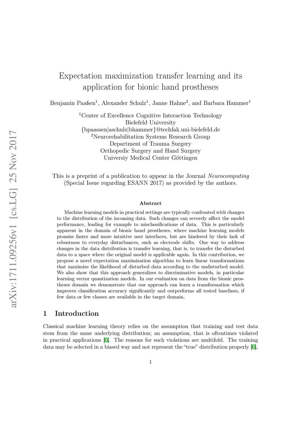 Machine learning models in practical settings are typically confronted with changes to the distribution of the incoming data. Such changes can severely affect the model performance, leading for example to misclassifications of data. This is particularly apparent in the domain of bionic hand prostheses, where machine learning models promise faster and more intuitive user interfaces, but are hindered by their lack of robustness to everyday disturbances, such as electrode shifts. One way to address changes in the data distribution is transfer learning, that is, to transfer the disturbed data to a space where the original model is applicable again. In this contribution, we propose a novel expectation maximization algorithm to learn linear transformations that maximize the likelihood of disturbed data after the transformation. We also show that this approach generalizes to discriminative models, in particular learning vector quantization models. In our evaluation on data from the bionic prostheses domain we demonstrate that our approach can learn a transformation which improves classification accuracy significantly and outperforms all tested baselines, if few data or few classes are available in the target domain.