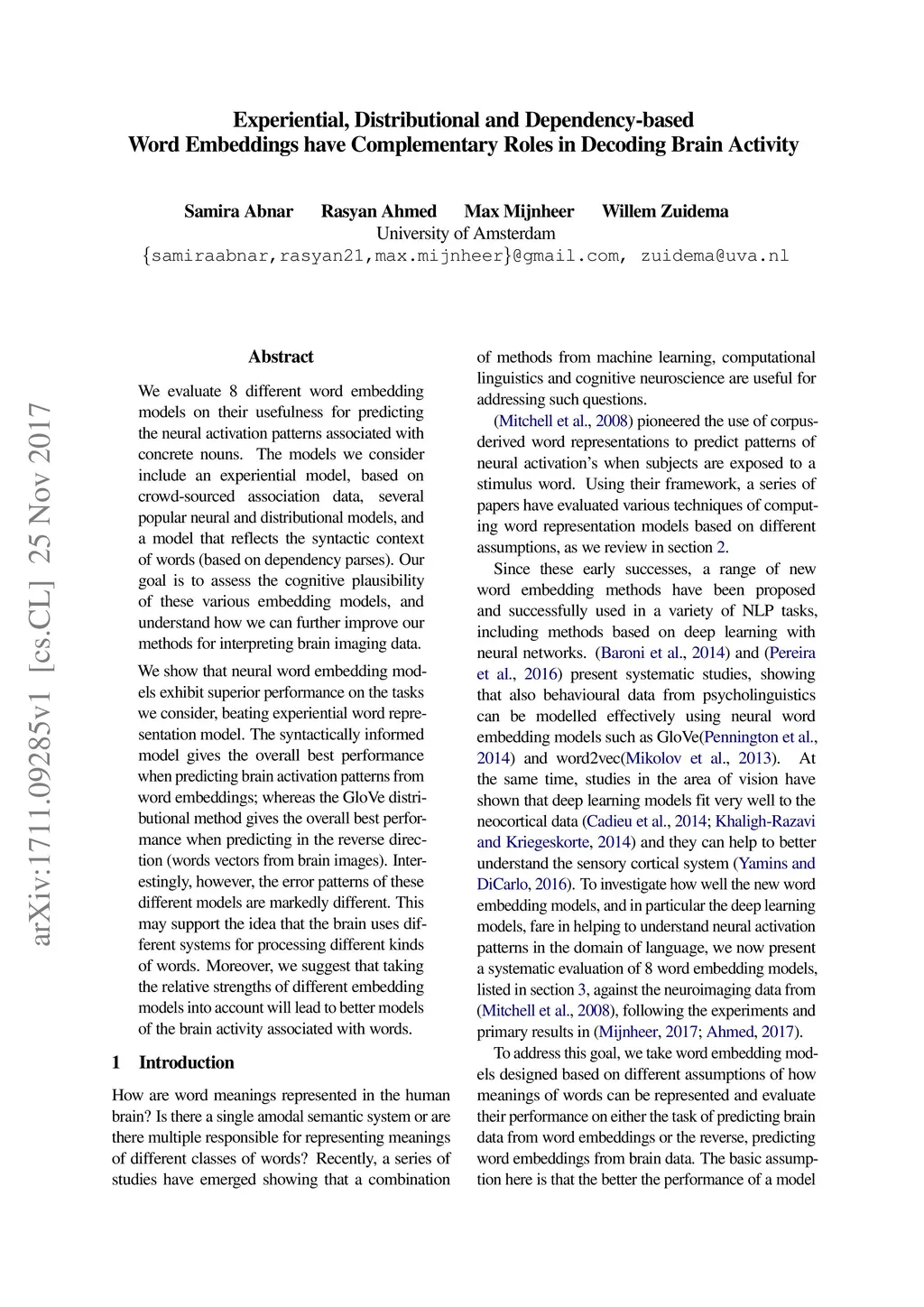 We evaluate 8 different word embedding models on their usefulness for predicting the neural activation patterns associated with concrete nouns. The models we consider include an experiential model, based on crowd-sourced association data, several popular neural and distributional models, and a model that reflects the syntactic context of words (based on dependency parses). Our goal is to assess the cognitive plausibility of these various embedding models, and understand how we can further improve our methods for interpreting brain imaging data. We show that neural word embedding models exhibit superior performance on the tasks we consider, beating experiential word representation model. The syntactically informed model gives the overall best performance when predicting brain activation patterns from word embeddings; whereas the GloVe distributional method gives the overall best performance when predicting in the reverse direction (words vectors from brain images). Interestingly, however, the error patterns of these different models are markedly different. This may support the idea that the brain uses different systems for processing different kinds of words. Moreover, we suggest that taking the relative strengths of different embedding models into account will lead to better models of the brain activity associated with words.