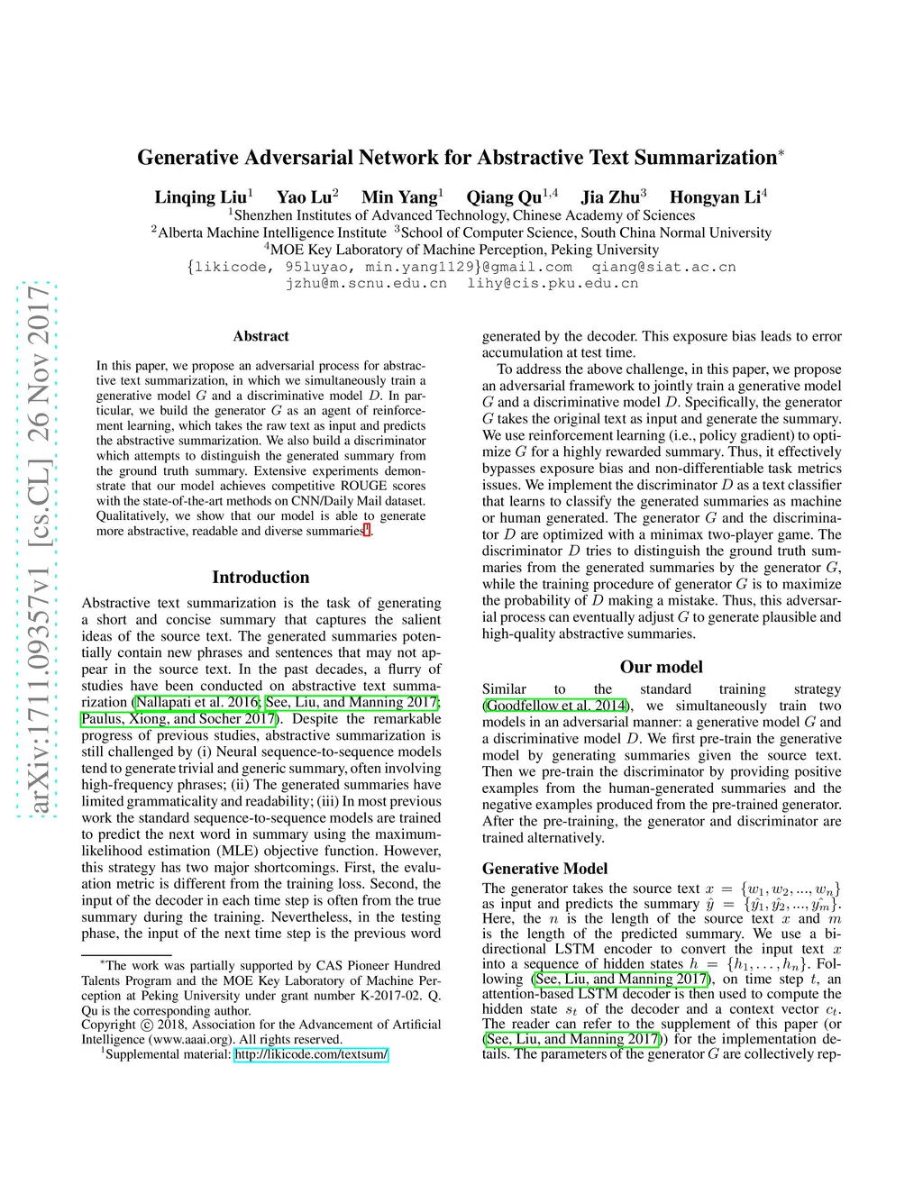 In this paper, we propose an adversarial process for abstractive text summarization, in which we simultaneously train a generative model G and a discriminative model D. In particular, we build the generator G as an agent of reinforcement learning, which takes the raw text as input and predicts the abstractive summarization. We also build a discriminator which attempts to distinguish the generated summary from the ground truth summary. Extensive experiments demonstrate that our model achieves competitive ROUGE scores with the state-of-the-art methods on CNN/Daily Mail dataset. Qualitatively, we show that our model is able to generate more abstractive, readable and diverse summaries.
