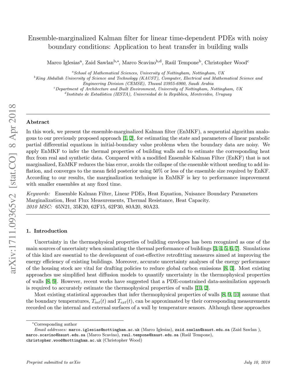 In this work, we present the ensemble-marginalized Kalman filter (EnMKF), a sequential algorithm analogous to our previously proposed approach [1,2], for estimating the state and parameters of linear parabolic partial differential equations in initial-boundary value problems when the boundary data are noisy. We apply EnMKF to infer the thermal properties of building walls and to estimate the corresponding heat flux from real and synthetic data. Compared with a modified Ensemble Kalman Filter (EnKF) that is not marginalized, EnMKF reduces the bias error, avoids the collapse of the ensemble without needing to add inflation, and converges to the mean field posterior using or less of the ensemble size required by EnKF. According to our results, the marginalization technique in EnMKF is key to performance improvement with smaller ensembles at any fixed time.