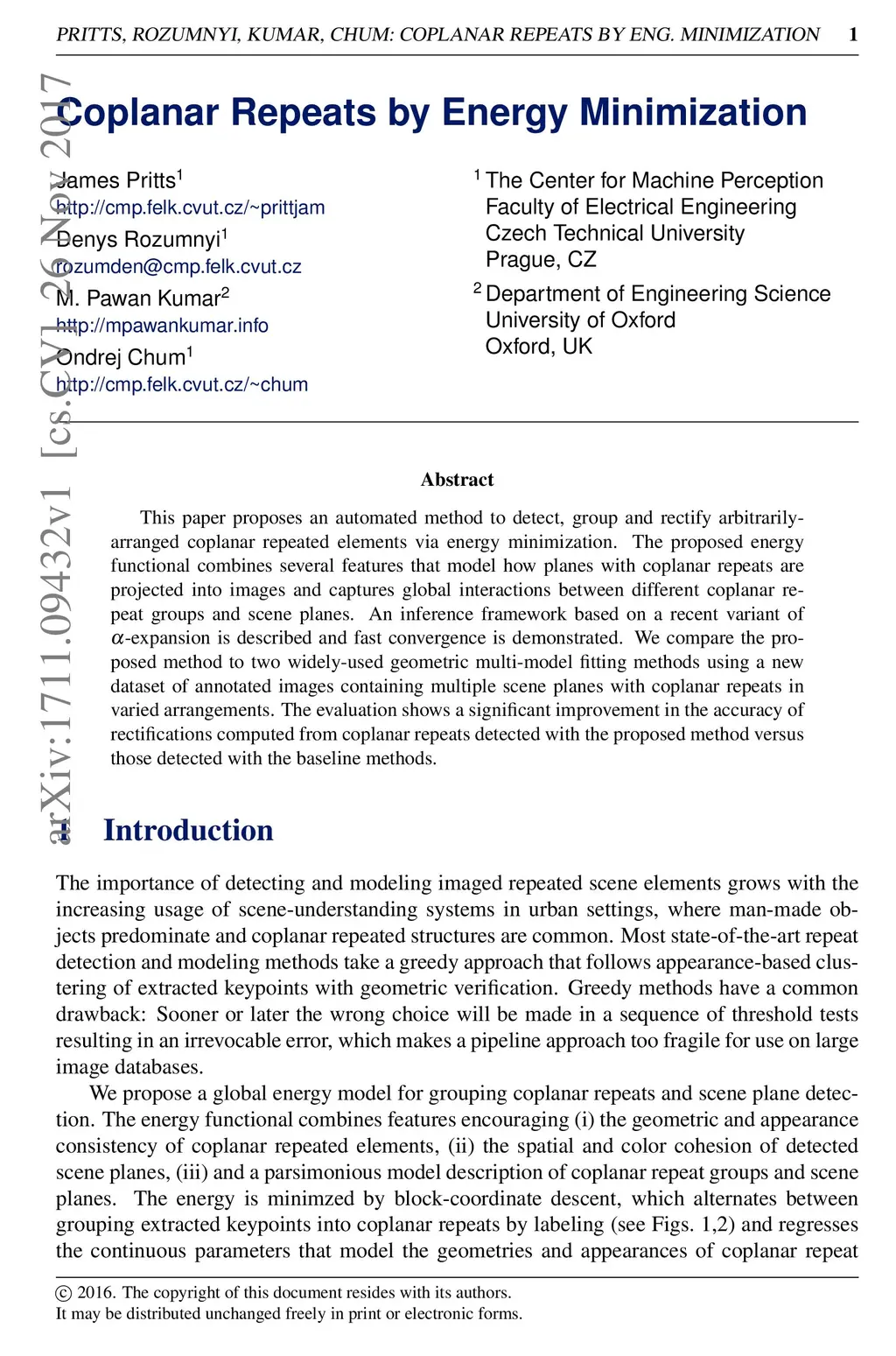 This paper proposes an automated method to detect, group and rectify arbitrarily-arranged coplanar repeated elements via energy minimization. The proposed energy functional combines several features that model how planes with coplanar repeats are projected into images and captures global interactions between different coplanar repeat groups and scene planes. An inference framework based on a recent variant of -expansion is described and fast convergence is demonstrated. We compare the proposed method to two widely-used geometric multi-model fitting methods using a new dataset of annotated images containing multiple scene planes with coplanar repeats in varied arrangements. The evaluation shows a significant improvement in the accuracy of rectifications computed from coplanar repeats detected with the proposed method versus those detected with the baseline methods.