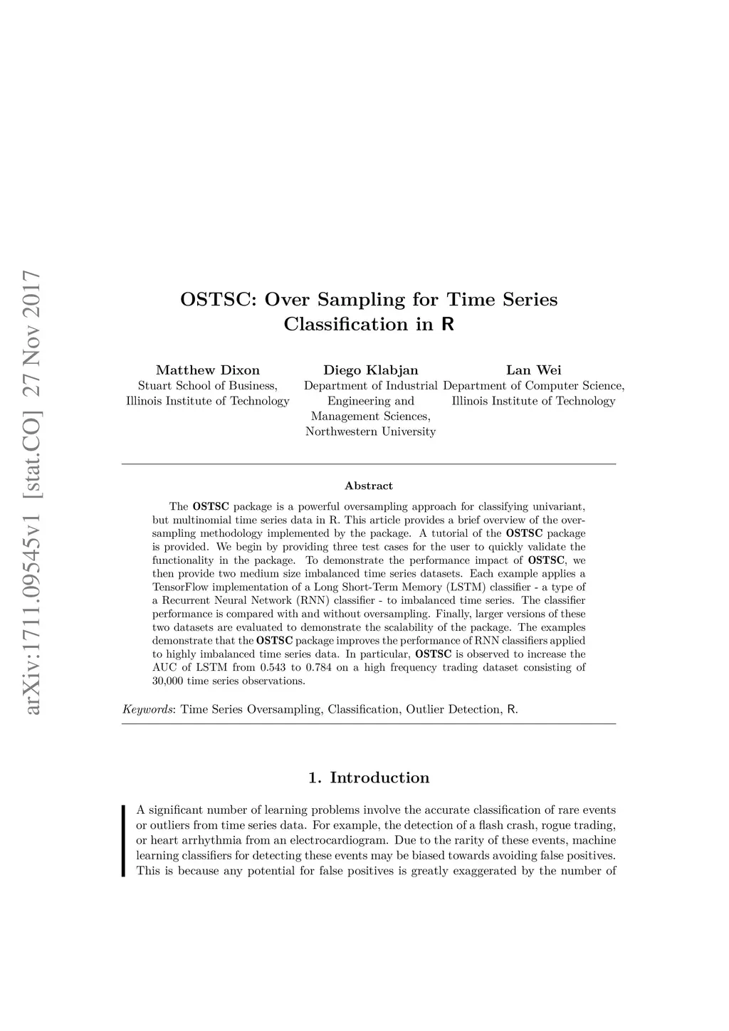 The OSTSC package is a powerful oversampling approach for classifying univariant, but multinomial time series data in R. This article provides a brief overview of the oversampling methodology implemented by the package. A tutorial of the OSTSC package is provided. We begin by providing three test cases for the user to quickly validate the functionality in the package. To demonstrate the performance impact of OSTSC, we then provide two medium size imbalanced time series datasets. Each example applies a TensorFlow implementation of a Long Short-Term Memory (LSTM) classifier - a type of a Recurrent Neural Network (RNN) classifier - to imbalanced time series. The classifier performance is compared with and without oversampling. Finally, larger versions of these two datasets are evaluated to demonstrate the scalability of the package. The examples demonstrate that the OSTSC package improves the performance of RNN classifiers applied to highly imbalanced time series data. In particular, OSTSC is observed to increase the AUC of LSTM from 0.543 to 0.784 on a high frequency trading dataset consisting of 30,000 time series observations.