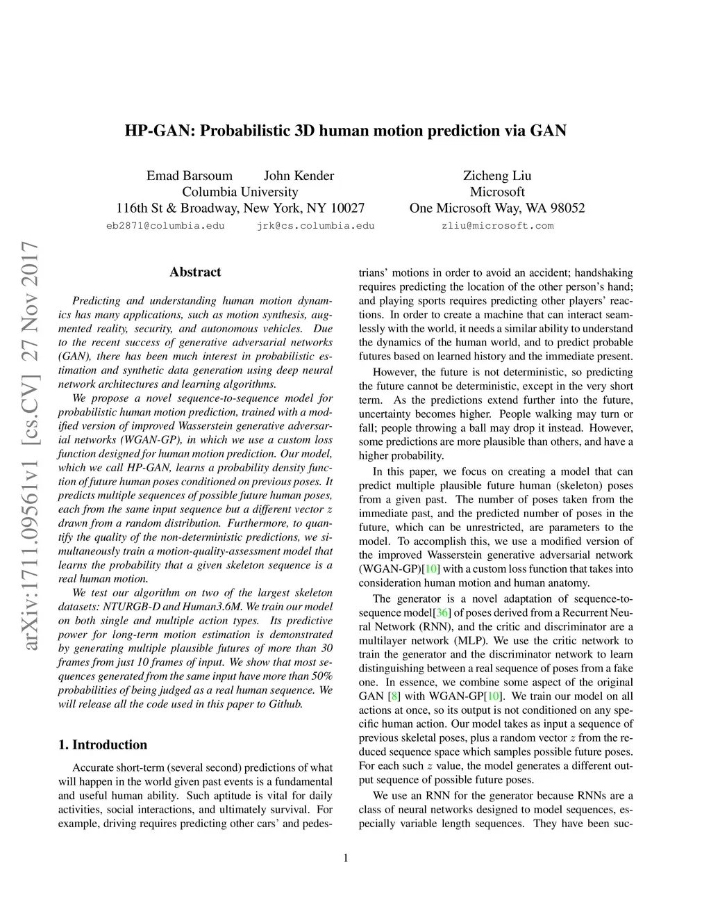 Predicting and understanding human motion dynamics has many applications, such as motion synthesis, augmented reality, security, and autonomous vehicles. Due to the recent success of generative adversarial networks (GAN), there has been much interest in probabilistic estimation and synthetic data generation using deep neural network architectures and learning algorithms. We propose a novel sequence-to-sequence model for probabilistic human motion prediction, trained with a modified version of improved Wasserstein generative adversarial networks (WGAN-GP), in which we use a custom loss function designed for human motion prediction. Our model, which we call HP-GAN, learns a probability density function of future human poses conditioned on previous poses. It predicts multiple sequences of possible future human poses, each from the same input sequence but a different vector z drawn from a random distribution. Furthermore, to quantify the quality of the non-deterministic predictions, we simultaneously train a motion-quality-assessment model that learns the probability that a given skeleton sequence is a real human motion. We test our algorithm on two of the largest skeleton datasets: NTURGB-D and Human3.6M. We train our model on both single and multiple action types. Its predictive power for long-term motion estimation is demonstrated by generating multiple plausible futures of more than 30 frames from just 10 frames of input. We show that most sequences generated from the same input have more than 50\% probabilities of being judged as a real human sequence. We will release all the code used in this paper to Github.