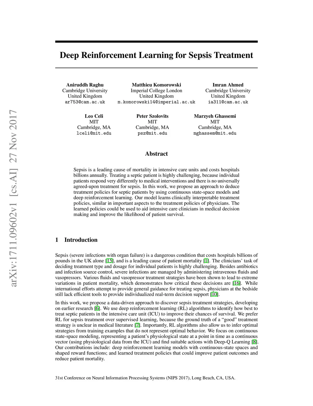 Sepsis is a leading cause of mortality in intensive care units and costs hospitals billions annually. Treating a septic patient is highly challenging, because individual patients respond very differently to medical interventions and there is no universally agreed-upon treatment for sepsis. In this work, we propose an approach to deduce treatment policies for septic patients by using continuous state-space models and deep reinforcement learning. Our model learns clinically interpretable treatment policies, similar in important aspects to the treatment policies of physicians. The learned policies could be used to aid intensive care clinicians in medical decision making and improve the likelihood of patient survival.