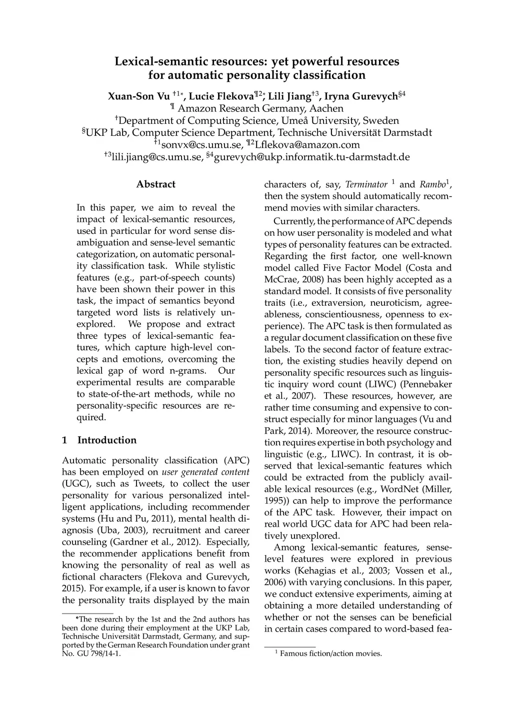 In this paper, we aim to reveal the impact of lexical-semantic resources, used in particular for word sense disambiguation and sense-level semantic categorization, on automatic personality classification task. While stylistic features (e.g., part-of-speech counts) have been shown their power in this task, the impact of semantics beyond targeted word lists is relatively unexplored. We propose and extract three types of lexical-semantic features, which capture high-level concepts and emotions, overcoming the lexical gap of word n-grams. Our experimental results are comparable to state-of-the-art methods, while no personality-specific resources are required.