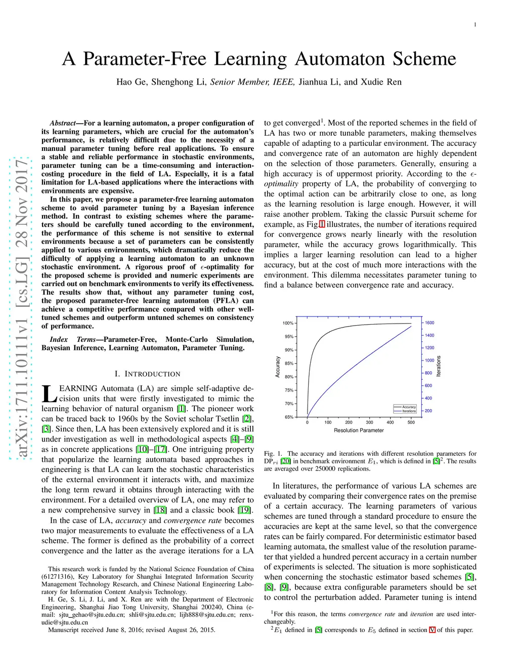 For a learning automaton, a proper configuration of its learning parameters, which are crucial for the automaton's performance, is relatively difficult due to the necessity of a manual parameter tuning before real applications. To ensure a stable and reliable performance in stochastic environments, parameter tuning can be a time-consuming and interaction-costing procedure in the field of LA. Especially, it is a fatal limitation for LA-based applications where the interactions with environments are expensive. In this paper, we propose a parameter-free learning automaton scheme to avoid parameter tuning by a Bayesian inference method. In contrast to existing schemes where the parameters should be carefully tuned according to the environment, the performance of this scheme is not sensitive to external environments because a set of parameters can be consistently applied to various environments, which dramatically reduce the difficulty of applying a learning automaton to an unknown stochastic environment. A rigorous proof of -optimality for the proposed scheme is provided and numeric experiments are carried out on benchmark environments to verify its effectiveness. The results show that, without any parameter tuning cost, the proposed parameter-free learning automaton (PFLA) can achieve a competitive performance compared with other well-tuned schemes and outperform untuned schemes on consistency of performance.