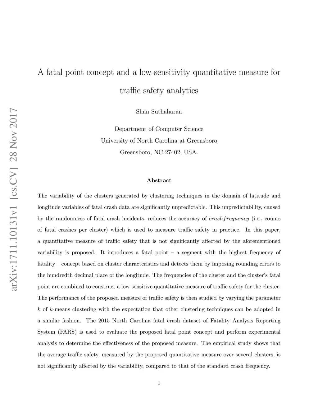 The variability of the clusters generated by clustering techniques in the domain of latitude and longitude variables of fatal crash data are significantly unpredictable. This unpredictability, caused by the randomness of fatal crash incidents, reduces the accuracy of crash frequency (i.e., counts of fatal crashes per cluster) which is used to measure traffic safety in practice. In this paper, a quantitative measure of traffic safety that is not significantly affected by the aforementioned variability is proposed. It introduces a fatal point -- a segment with the highest frequency of fatality -- concept based on cluster characteristics and detects them by imposing rounding errors to the hundredth decimal place of the longitude. The frequencies of the cluster and the cluster's fatal point are combined to construct a low-sensitive quantitative measure of traffic safety for the cluster. The performance of the proposed measure of traffic safety is then studied by varying the parameter k of k-means clustering with the expectation that other clustering techniques can be adopted in a similar fashion. The 2015 North Carolina fatal crash dataset of Fatality Analysis Reporting System (FARS) is used to evaluate the proposed fatal point concept and perform experimental analysis to determine the effectiveness of the proposed measure. The empirical study shows that the average traffic safety, measured by the proposed quantitative measure over several clusters, is not significantly affected by the variability, compared to that of the standard crash frequency.