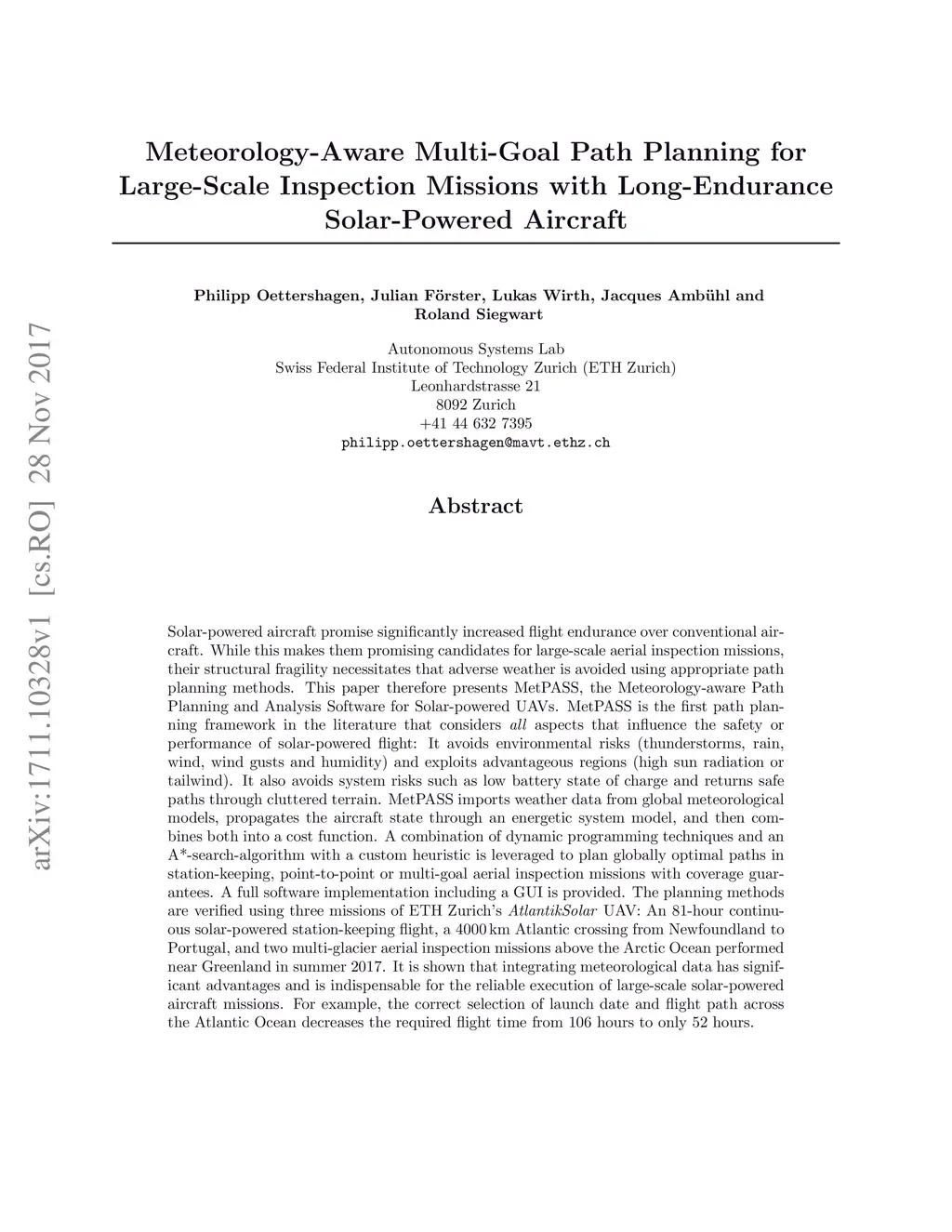 Solar-powered aircraft promise significantly increased flight endurance over conventional aircraft. While this makes them promising candidates for large-scale aerial inspection missions, their structural fragility necessitates that adverse weather is avoided using appropriate path planning methods. This paper therefore presents MetPASS, the Meteorology-aware Path Planning and Analysis Software for Solar-powered UAVs. MetPASS is the first path planning framework in the literature that considers all aspects that influence the safety or performance of solar-powered flight: It avoids environmental risks (thunderstorms, rain, wind, wind gusts and humidity) and exploits advantageous regions (high sun radiation or tailwind). It also avoids system risks such as low battery state of charge and returns safe paths through cluttered terrain. MetPASS imports weather data from global meteorological models, propagates the aircraft state through an energetic system model, and then combines both into a cost function. A combination of dynamic programming techniques and an A*-search-algorithm with a custom heuristic is leveraged to plan globally optimal paths in station-keeping, point-to-point or multi-goal aerial inspection missions with coverage guarantees. A full software implementation including a GUI is provided. The planning methods are verified using three missions of ETH Zurich's AtlantikSolar UAV: An 81-hour continuous solar-powered station-keeping flight, a 4000km Atlantic crossing from Newfoundland to Portugal, and two multi-glacier aerial inspection missions above the Arctic Ocean performed near Greenland in summer 2017.