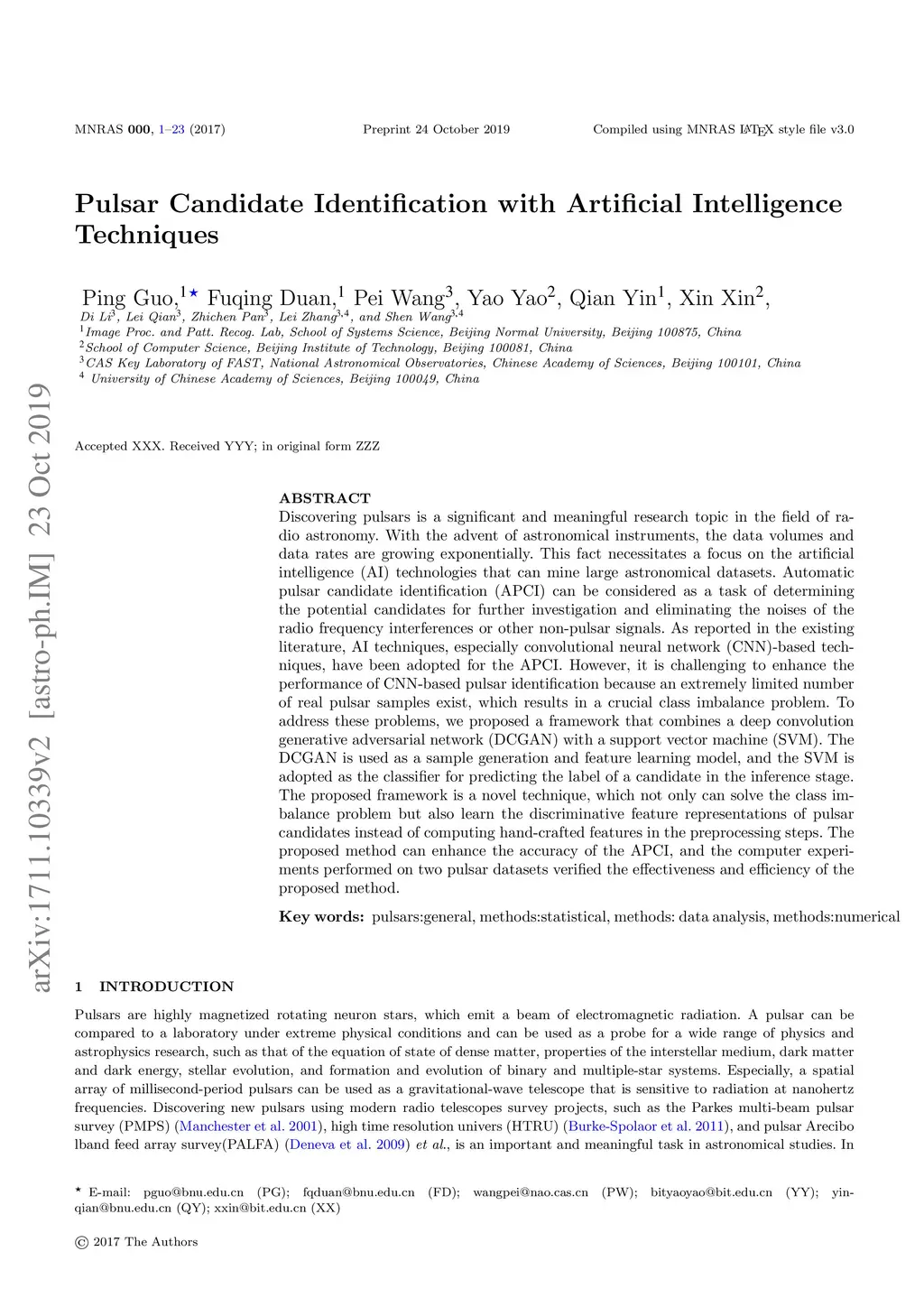 Discovering pulsars is a significant and meaningful research topic in the field of radio astronomy. With the advent of astronomical instruments such as he Five-hundred-meter Aperture Spherical Telescope (FAST) in China, data volumes and data rates are exponentially growing. This fact necessitates a focus on artificial intelligence (AI) technologies that can perform the automatic pulsar candidate identification to mine large astronomical data sets. Automatic pulsar candidate identification can be considered as a task of determining potential candidates for further investigation and eliminating noises of radio frequency interferences or other non-pulsar signals. It is very hard to raise the performance of DCNN-based pulsar identification because the limited training samples restrict network structure to be designed deep enough for learning good features as well as the crucial class imbalance problem due to very limited number of real pulsar samples. To address these problems, we proposed a framework which combines deep convolution generative adversarial network (DCGAN) with support vector machine (SVM) to deal with imbalance class problem and to improve pulsar identification accuracy. DCGAN is used as sample generation and feature learning model, and SVM is adopted as the classifier for predicting candidate's labels in the inference stage. The proposed framework is a novel technique which not only can solve imbalance class problem but also can learn discriminative feature representations of pulsar candidates instead of computing hand-crafted features in preprocessing steps too, which makes it more accurate for automatic pulsar candidate selection. Experiments on two pulsar datasets verify the effectiveness and efficiency of our proposed method.