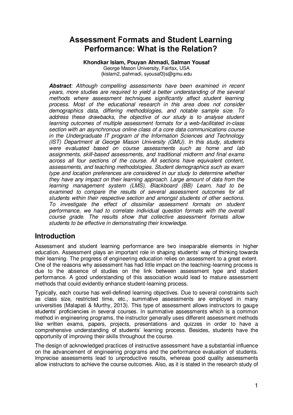 Although compelling assessments have been examined in recent years, more studies are required to yield a better understanding of the several methods where assessment techniques significantly affect student learning process. Most of the educational research in this area does not consider demographics data, differing methodologies, and notable sample size. To address these drawbacks, the objective of our study is to analyse student learning outcomes of multiple assessment formats for a web-facilitated in-class section with an asynchronous online class of a core data communications course in the Undergraduate IT program of the Information Sciences and Technology (IST) Department at George Mason University (GMU). In this study, students were evaluated based on course assessments such as home and lab assignments, skill-based assessments, and traditional midterm and final exams across all four sections of the course. All sections have equivalent content, assessments, and teaching methodologies. Student demographics such as exam type and location preferences are considered in our study to determine whether they have any impact on their learning approach. Large amount of data from the learning management system (LMS), Blackboard (BB) Learn, had to be examined to compare the results of several assessment outcomes for all students within their respective section and amongst students of other sections. To investigate the effect of dissimilar assessment formats on student performance, we had to correlate individual question formats with the overall course grade. The results show that collective assessment formats allow students to be effective in demonstrating their knowledge.