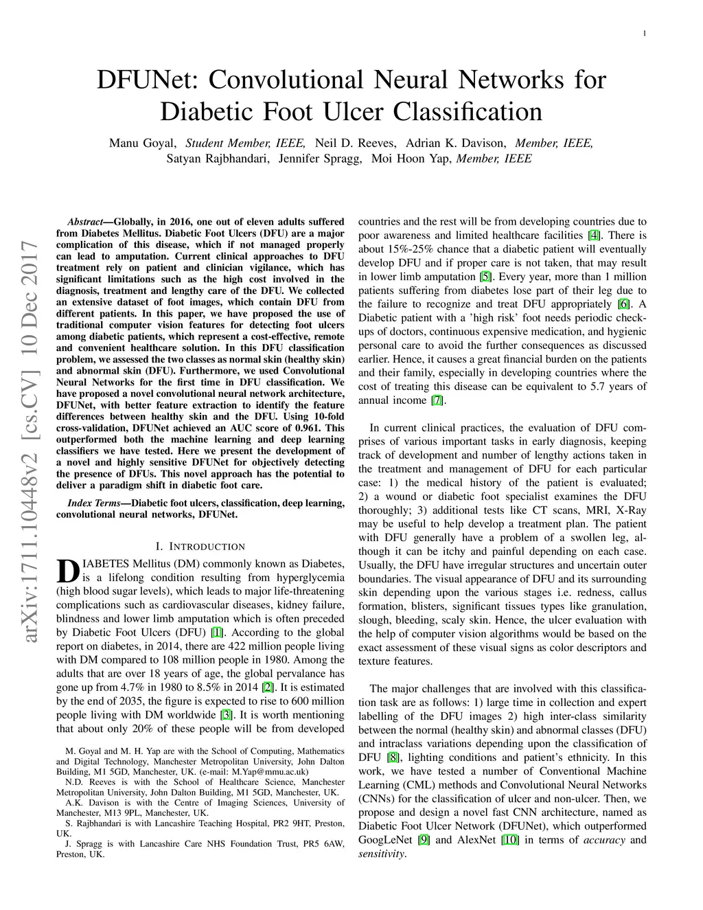 Globally, in 2016, one out of eleven adults suffered from Diabetes Mellitus. Diabetic Foot Ulcers (DFU) are a major complication of this disease, which if not managed properly can lead to amputation. Current clinical approaches to DFU treatment rely on patient and clinician vigilance, which has significant limitations such as the high cost involved in the diagnosis, treatment and lengthy care of the DFU. We collected an extensive dataset of foot images, which contain DFU from different patients. In this paper, we have proposed the use of traditional computer vision features for detecting foot ulcers among diabetic patients, which represent a cost-effective, remote and convenient healthcare solution. Furthermore, we used Convolutional Neural Networks (CNNs) for the first time in DFU classification. We have proposed a novel convolutional neural network architecture, DFUNet, with better feature extraction to identify the feature differences between healthy skin and the DFU. Using 10-fold cross-validation, DFUNet achieved an AUC score of 0.962. This outperformed both the machine learning and deep learning classifiers we have tested. Here we present the development of a novel and highly sensitive DFUNet for objectively detecting the presence of DFUs. This novel approach has the potential to deliver a paradigm shift in diabetic foot care.