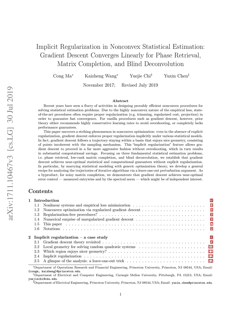 Recent years have seen a flurry of activities in designing provably efficient nonconvex procedures for solving statistical estimation problems. Due to the highly nonconvex nature of the empirical loss, state-of-the-art procedures often require proper regularization (e.g. trimming, regularized cost, projection) in order to guarantee fast convergence. For vanilla procedures such as gradient descent, however, prior theory either recommends highly conservative learning rates to avoid overshooting, or completely lacks performance guarantees. This paper uncovers a striking phenomenon in nonconvex optimization: even in the absence of explicit regularization, gradient descent enforces proper regularization implicitly under various statistical models. In fact, gradient descent follows a trajectory staying within a basin that enjoys nice geometry, consisting of points incoherent with the sampling mechanism. This "implicit regularization" feature allows gradient descent to proceed in a far more aggressive fashion without overshooting, which in turn results in substantial computational savings. Focusing on three fundamental statistical estimation problems, i.e. phase retrieval, low-rank matrix completion, and blind deconvolution, we establish that gradient descent achieves near-optimal statistical and computational guarantees without explicit regularization. In particular, by marrying statistical modeling with generic optimization theory, we develop a general recipe for analyzing the trajectories of iterative algorithms via a leave-one-out perturbation argument. As a byproduct, for noisy matrix completion, we demonstrate that gradient descent achieves near-optimal error control --- measured entrywise and by the spectral norm --- which might be of independent interest.