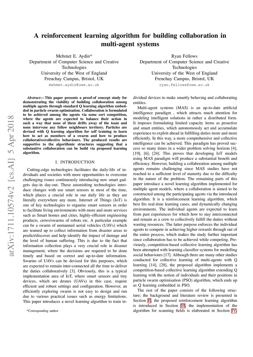This paper presents a proof-of concept study for demonstrating the viability of building collaboration among multiple agents through standard Q learning algorithm embedded in particle swarm optimisation. Collaboration is formulated to be achieved among the agents via some sort competition, where the agents are expected to balance their action in such a way that none of them drifts away of the team and none intervene any fellow neighbours territory. Particles are devised with Q learning algorithm for self training to learn how to act as members of a swarm and how to produce collaborative/collective behaviours. The produced results are supportive to the algorithmic structures suggesting that a substantive collaboration can be build via proposed learning algorithm.