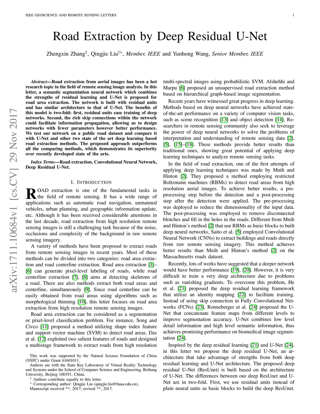 Road extraction from aerial images has been a hot research topic in the field of remote sensing image analysis. In this letter, a semantic segmentation neural network which combines the strengths of residual learning and U-Net is proposed for road area extraction. The network is built with residual units and has similar architecture to that of U-Net. The benefits of this model is two-fold: first, residual units ease training of deep networks. Second, the rich skip connections within the network could facilitate information propagation, allowing us to design networks with fewer parameters however better performance. We test our network on a public road dataset and compare it with U-Net and other two state of the art deep learning based road extraction methods. The proposed approach outperforms all the comparing methods, which demonstrates its superiority over recently developed state of the arts.