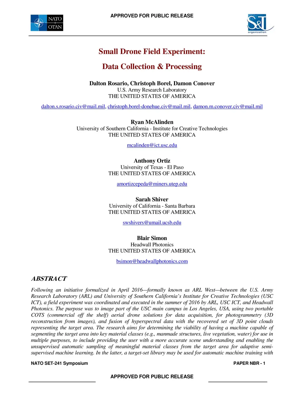 Following an initiative formalized in April 2016 formally known as ARL West between the U.S. Army Research Laboratory (ARL) and University of Southern California's Institute for Creative Technologies (USC ICT), a field experiment was coordinated and executed in the summer of 2016 by ARL, USC ICT, and Headwall Photonics. The purpose was to image part of the USC main campus in Los Angeles, USA, using two portable COTS (commercial off the shelf) aerial drone solutions for data acquisition, for photogrammetry (3D reconstruction from images), and fusion of hyperspectral data with the recovered set of 3D point clouds representing the target area. The research aims for determining the viability of having a machine capable of segmenting the target area into key material classes (e.g., manmade structures, live vegetation, water) for use in multiple purposes, to include providing the user with a more accurate scene understanding and enabling the unsupervised automatic sampling of meaningful material classes from the target area for adaptive semi-supervised machine learning. In the latter, a target set library may be used for automatic machine training with data of local material classes, as an example, to increase the prediction chances of machines recognizing targets. The field experiment and associated data post processing approach to correct for reflectance, geo-rectify, recover the area's dense point clouds from images, register spectral with elevation properties of scene surfaces from the independently collected datasets, and generate the desired scene segmented maps are discussed. Lessons learned from the experience are also highlighted throughout the paper.