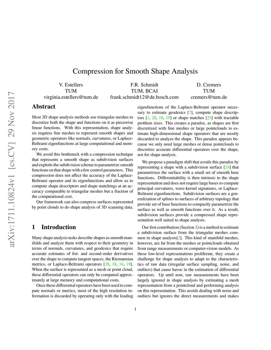 Most 3D shape analysis methods use triangular meshes to discretize both the shape and functions on it as piecewise linear functions. With this representation, shape analysis requires fine meshes to represent smooth shapes and geometric operators like normals, curvatures, or Laplace-Beltrami eigenfunctions at large computational and memory costs. We avoid this bottleneck with a compression technique that represents a smooth shape as subdivision surfaces and exploits the subdivision scheme to parametrize smooth functions on that shape with a few control parameters. This compression does not affect the accuracy of the Laplace-Beltrami operator and its eigenfunctions and allow us to compute shape descriptors and shape matchings at an accuracy comparable to triangular meshes but a fraction of the computational cost. Our framework can also compress surfaces represented by point clouds to do shape analysis of 3D scanning data.
