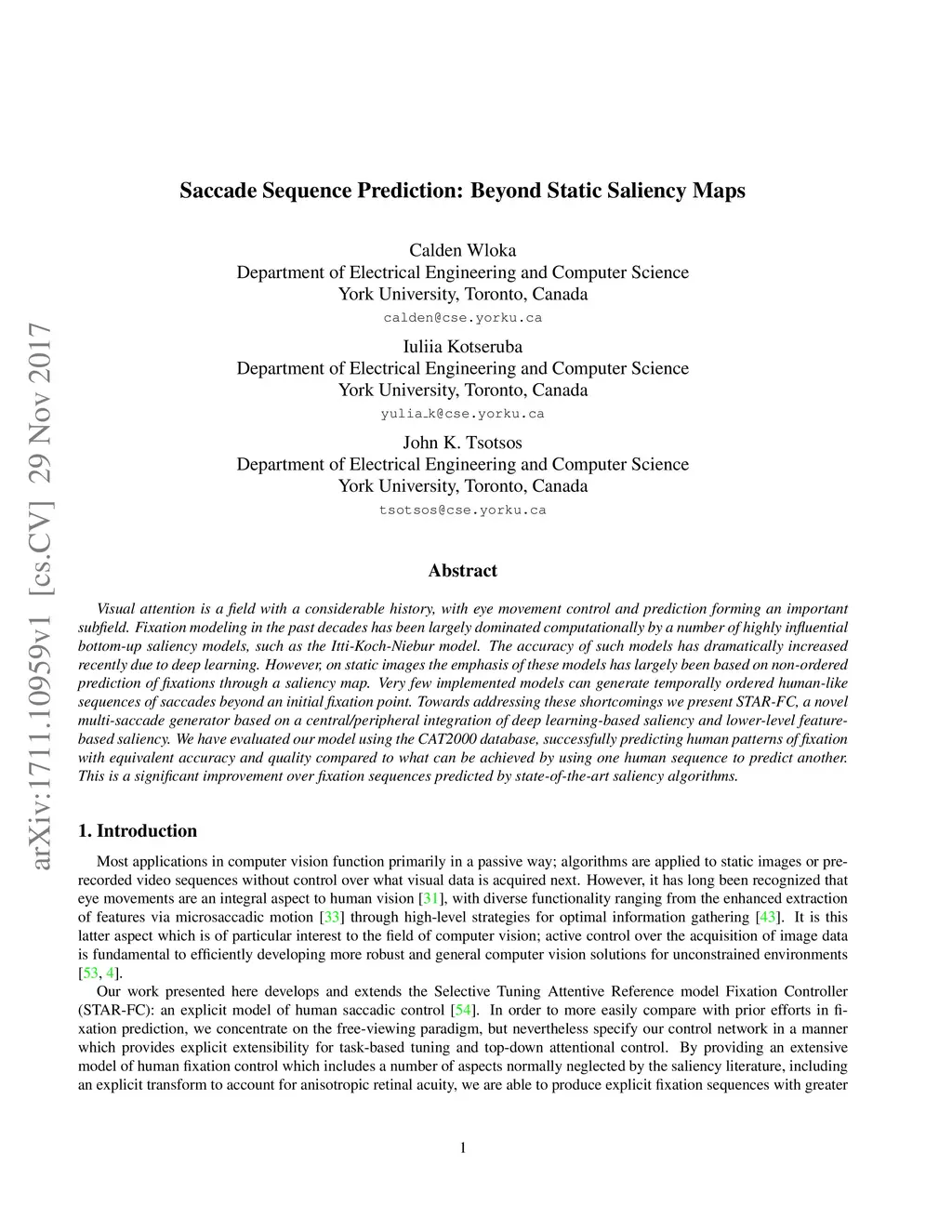 Visual attention is a field with a considerable history, with eye movement control and prediction forming an important subfield. Fixation modeling in the past decades has been largely dominated computationally by a number of highly influential bottom-up saliency models, such as the Itti-Koch-Niebur model. The accuracy of such models has dramatically increased recently due to deep learning. However, on static images the emphasis of these models has largely been based on non-ordered prediction of fixations through a saliency map. Very few implemented models can generate temporally ordered human-like sequences of saccades beyond an initial fixation point. Towards addressing these shortcomings we present STAR-FC, a novel multi-saccade generator based on a central/peripheral integration of deep learning-based saliency and lower-level feature-based saliency. We have evaluated our model using the CAT2000 database, successfully predicting human patterns of fixation with equivalent accuracy and quality compared to what can be achieved by using one human sequence to predict another. This is a significant improvement over fixation sequences predicted by state-of-the-art saliency algorithms.