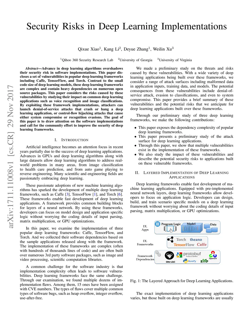 Advance in deep learning algorithms overshadows their security risk in software implementations. This paper discloses a set of vulnerabilities in popular deep learning frameworks including Caffe, TensorFlow, and Torch. Contrast to the small code size of deep learning models, these deep learning frameworks are complex and contain heavy dependencies on numerous open source packages. This paper considers the risks caused by these vulnerabilities by studying their impact on common deep learning applications such as voice recognition and image classifications. By exploiting these framework implementations, attackers can launch denial-of-service attacks that crash or hang a deep learning application, or control-flow hijacking attacks that cause either system compromise or recognition evasions. The goal of this paper is to draw attention on the software implementations and call for the community effort to improve the security of deep learning frameworks.