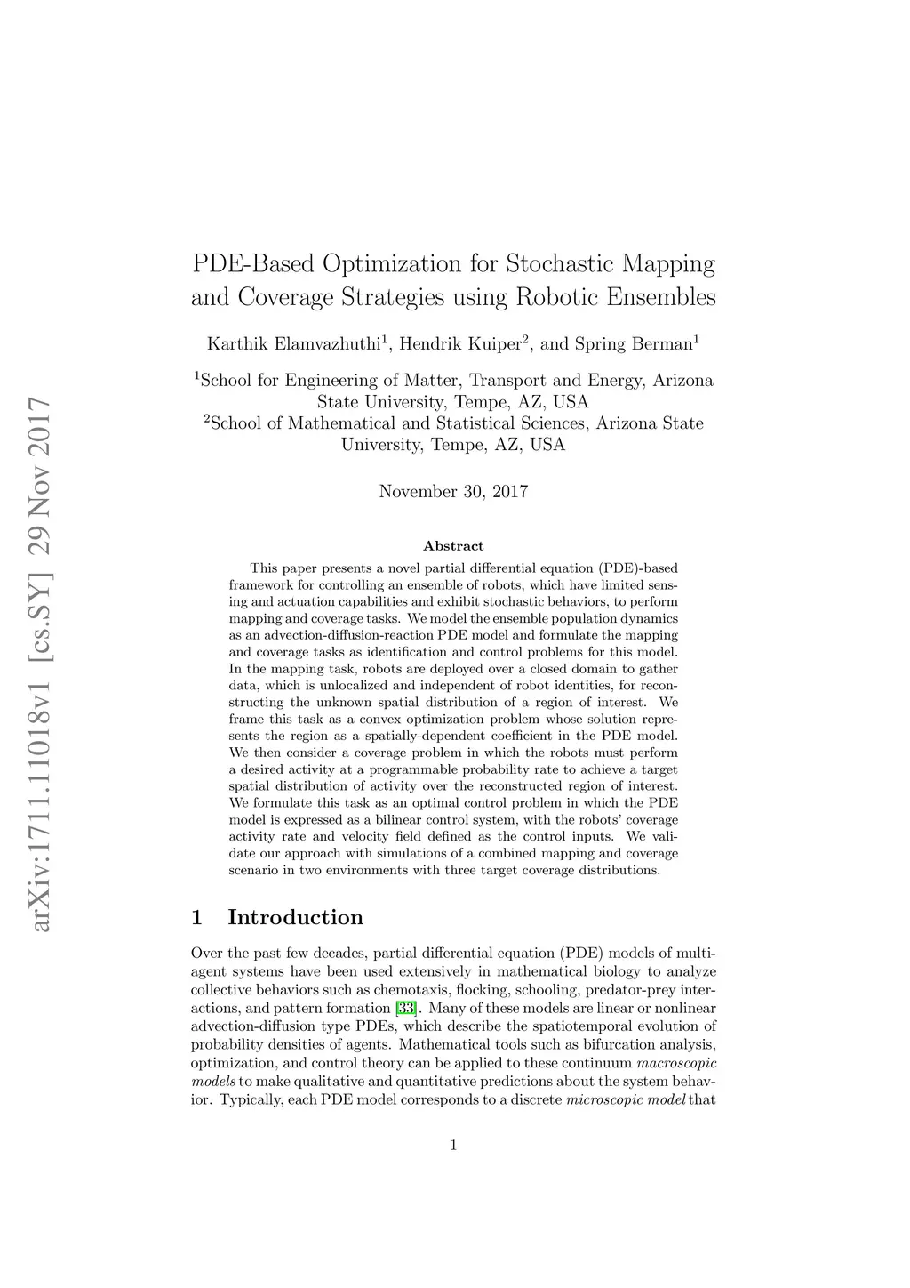 This paper presents a novel partial differential equation (PDE)-based framework for controlling an ensemble of robots, which have limited sensing and actuation capabilities and exhibit stochastic behaviors, to perform mapping and coverage tasks. We model the ensemble population dynamics as an advection-diffusion-reaction PDE model and formulate the mapping and coverage tasks as identification and control problems for this model. In the mapping task, robots are deployed over a closed domain to gather data, which is unlocalized and independent of robot identities, for reconstructing the unknown spatial distribution of a region of interest. We frame this task as a convex optimization problem whose solution represents the region as a spatially-dependent coefficient in the PDE model. We then consider a coverage problem in which the robots must perform a desired activity at a programmable probability rate to achieve a target spatial distribution of activity over the reconstructed region of interest. We formulate this task as an optimal control problem in which the PDE model is expressed as a bilinear control system, with the robots' coverage activity rate and velocity field defined as the control inputs. We validate our approach with simulations of a combined mapping and coverage scenario in two environments with three target coverage distributions.