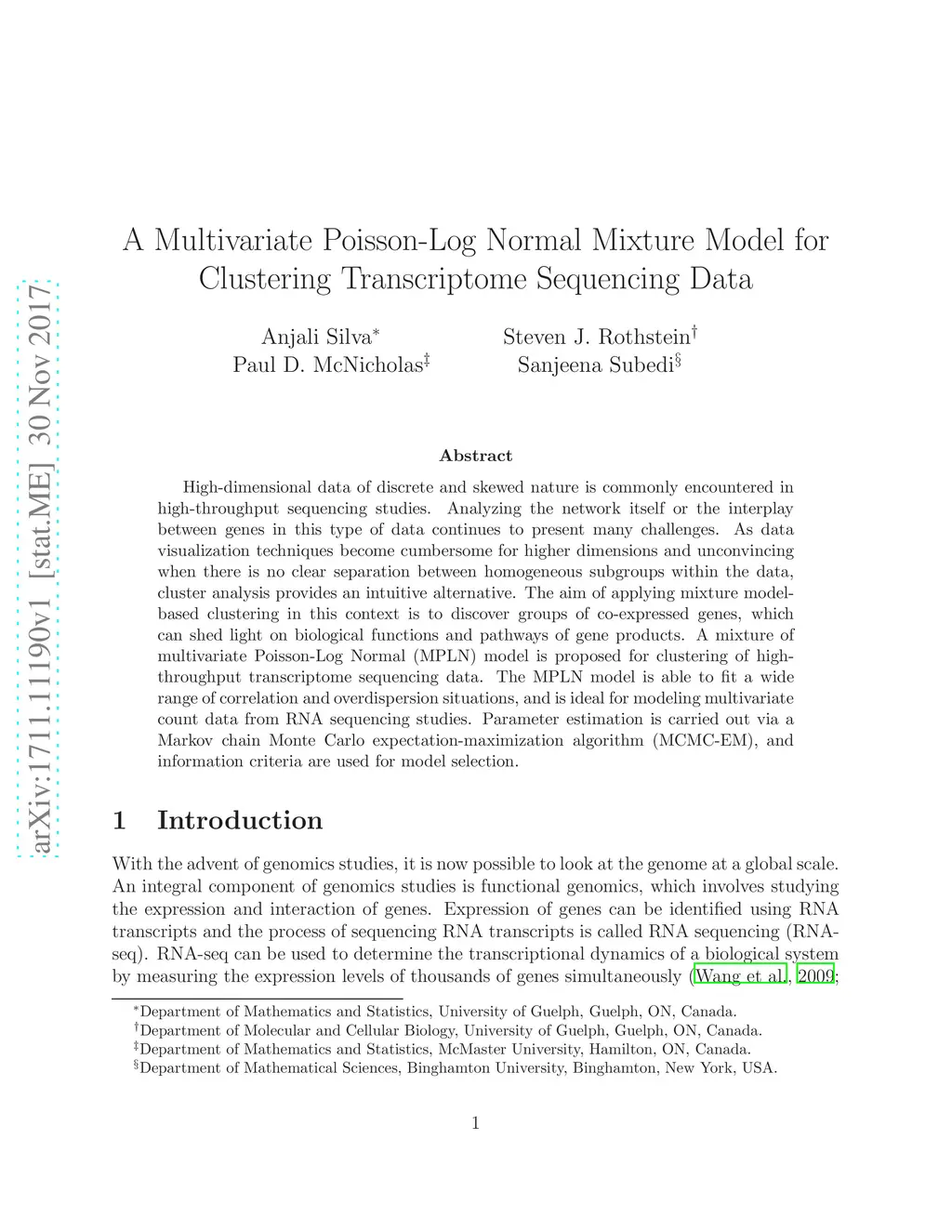 High-dimensional data of discrete and skewed nature is commonly encountered in high-throughput sequencing studies. Analyzing the network itself or the interplay between genes in this type of data continues to present many challenges. As data visualization techniques become cumbersome for higher dimensions and unconvincing when there is no clear separation between homogeneous subgroups within the data, cluster analysis provides an intuitive alternative. The aim of applying mixture model-based clustering in this context is to discover groups of co-expressed genes, which can shed light on biological functions and pathways of gene products. A mixture of multivariate Poisson-Log Normal (MPLN) model is proposed for clustering of high-throughput transcriptome sequencing data. The MPLN model is able to fit a wide range of correlation and overdispersion situations, and is ideal for modeling multivariate count data from RNA sequencing studies. Parameter estimation is carried out via a Markov chain Monte Carlo expectation-maximization algorithm (MCMC-EM), and information criteria are used for model selection.