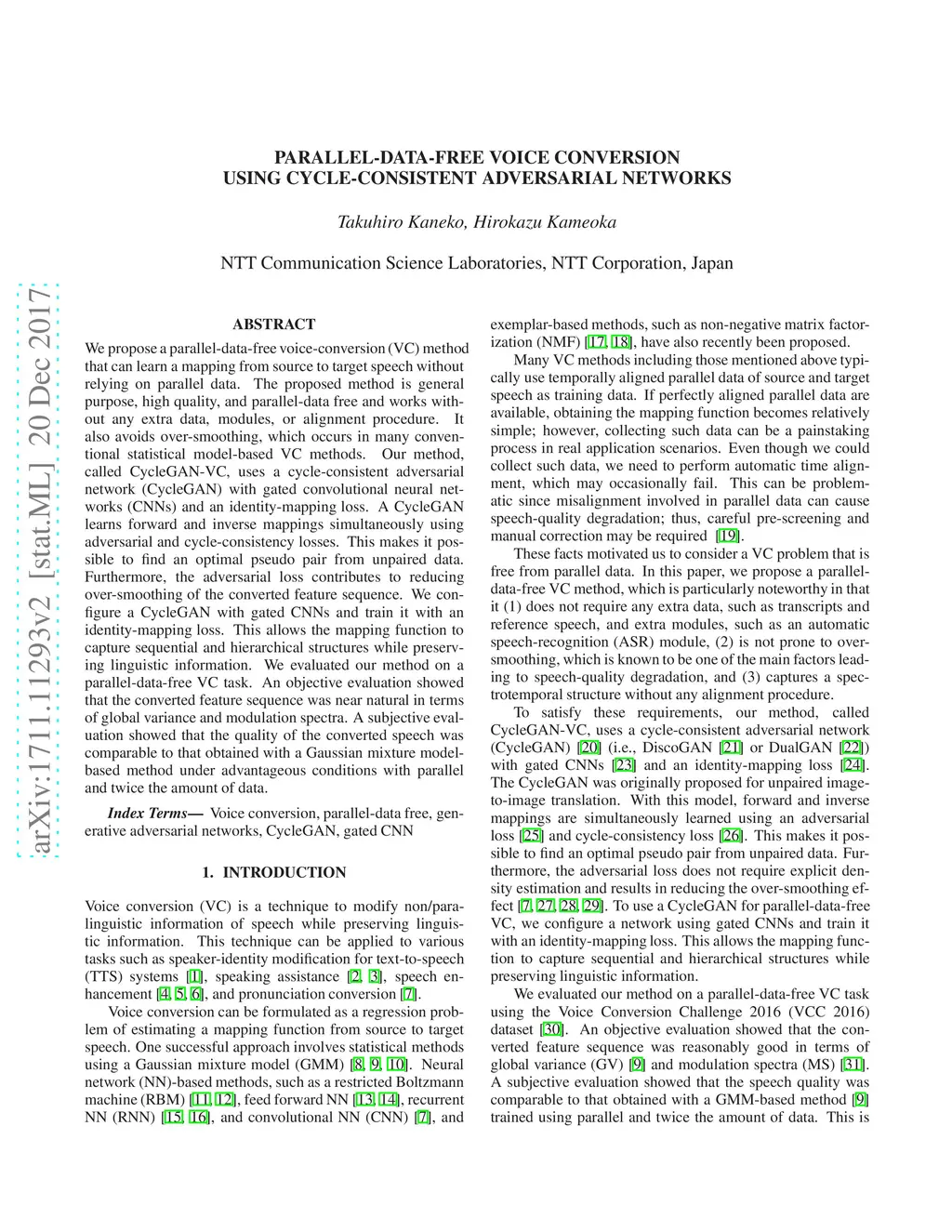 Parallel-Data-Free Voice Conversion Using Cycle-Consistent Adversarial