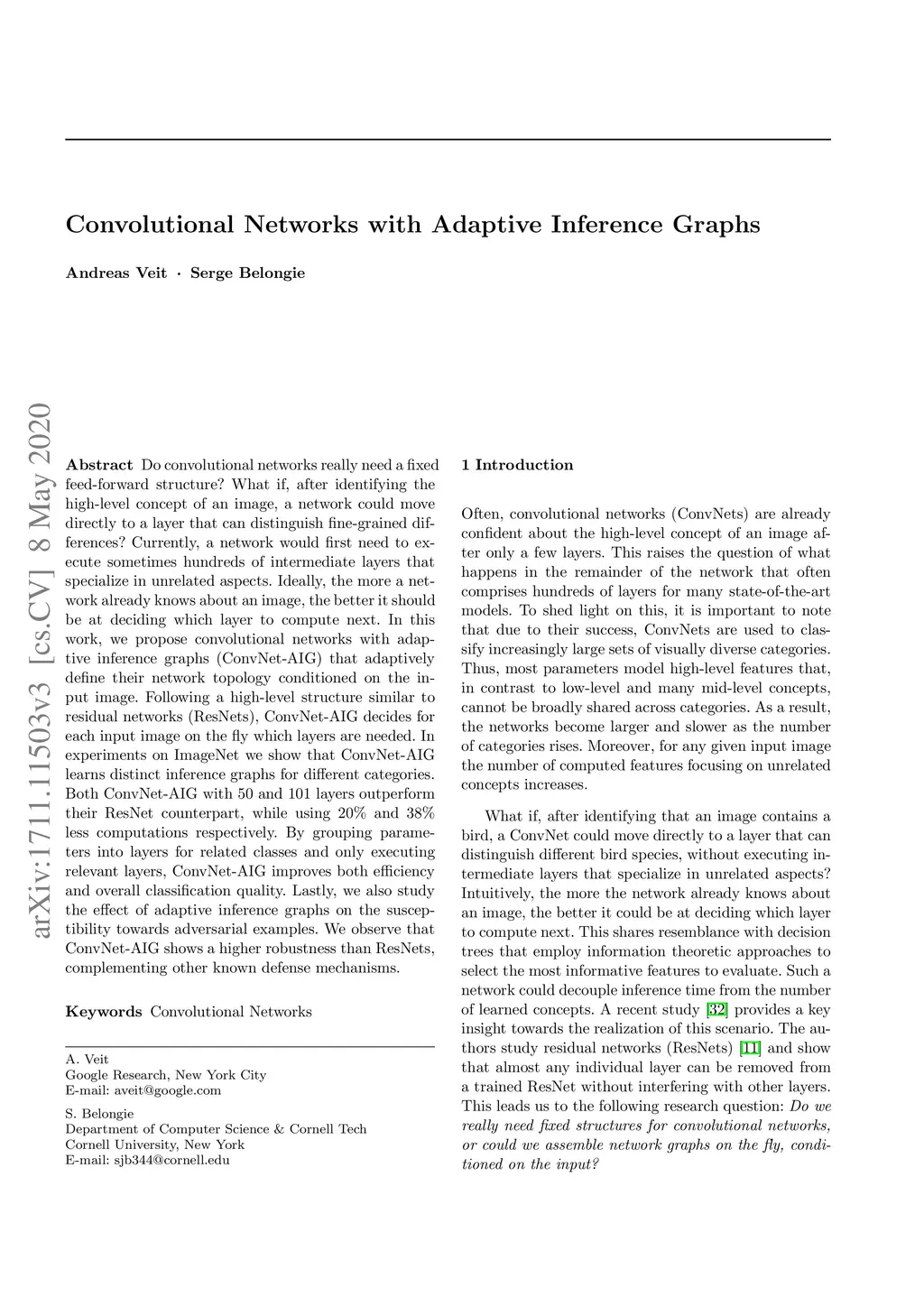 Do convolutional networks really need a fixed feed-forward structure? What if, after identifying the high-level concept of an image, a network could move directly to a layer that can distinguish fine-grained differences? Currently, a network would first need to execute sometimes hundreds of intermediate layers that specialize in unrelated aspects. Ideally, the more a network already knows about an image, the better it should be at deciding which layer to compute next. In this work, we propose convolutional networks with adaptive inference graphs (ConvNet-AIG) that adaptively define their network topology conditioned on the input image. Following a high-level structure similar to residual networks (ResNets), ConvNet-AIG decides for each input image on the fly which layers are needed. In experiments on ImageNet we show that ConvNet-AIG learns distinct inference graphs for different categories. Both ConvNet-AIG with 50 and 101 layers outperform their ResNet counterpart, while using 20% and 38% less computations respectively. By grouping parameters into layers for related classes and only executing relevant layers, ConvNet-AIG improves both efficiency and overall classification quality. Lastly, we also study the effect of adaptive inference graphs on the susceptibility towards adversarial examples. We observe that ConvNet-AIG shows a higher robustness than ResNets, complementing other known defense mechanisms.