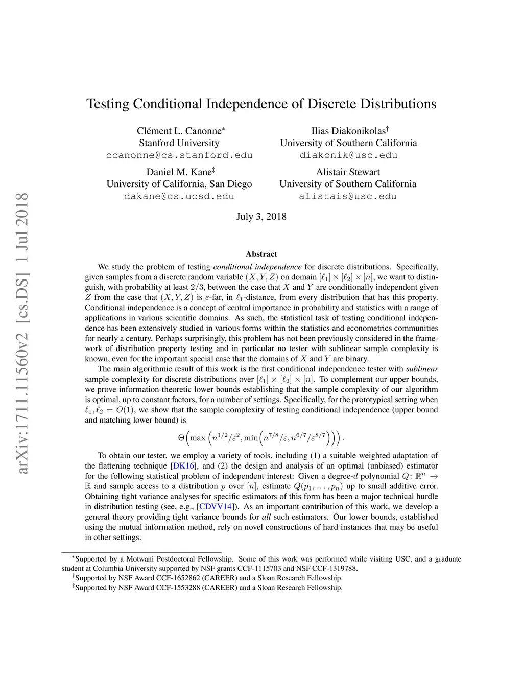 We study the problem of testing \emph{conditional independence} for discrete distributions. Specifically, given samples from a discrete random variable on domain , we want to distinguish, with probability at least , between the case that and are conditionally independent given from the case that is -far, in -distance, from every distribution that has this property. Conditional independence is a concept of central importance in probability and statistics with a range of applications in various scientific domains. As such, the statistical task of testing conditional independence has been extensively studied in various forms within the statistics and econometrics communities for nearly a century. Perhaps surprisingly, this problem has not been previously considered in the framework of distribution property testing and in particular no tester with sublinear sample complexity is known, even for the important special case that the domains of and are binary. The main algorithmic result of this work is the first conditional independence tester with {\em sublinear} sample complexity for discrete distributions over . To complement our upper bounds, we prove information-theoretic lower bounds establishing that the sample complexity of our algorithm is optimal, up to constant factors, for a number of settings. Specifically, for the prototypical setting when , we show that the sample complexity of testing conditional independence (upper bound and matching lower bound) is \[ \Theta\left({\max\left(n^{1/2}/\epsilon^2,\min\left(n^{7/8}/\epsilon,n^{6/7}/\epsilon^{8/7}\right)\right)}\right)\,. \]