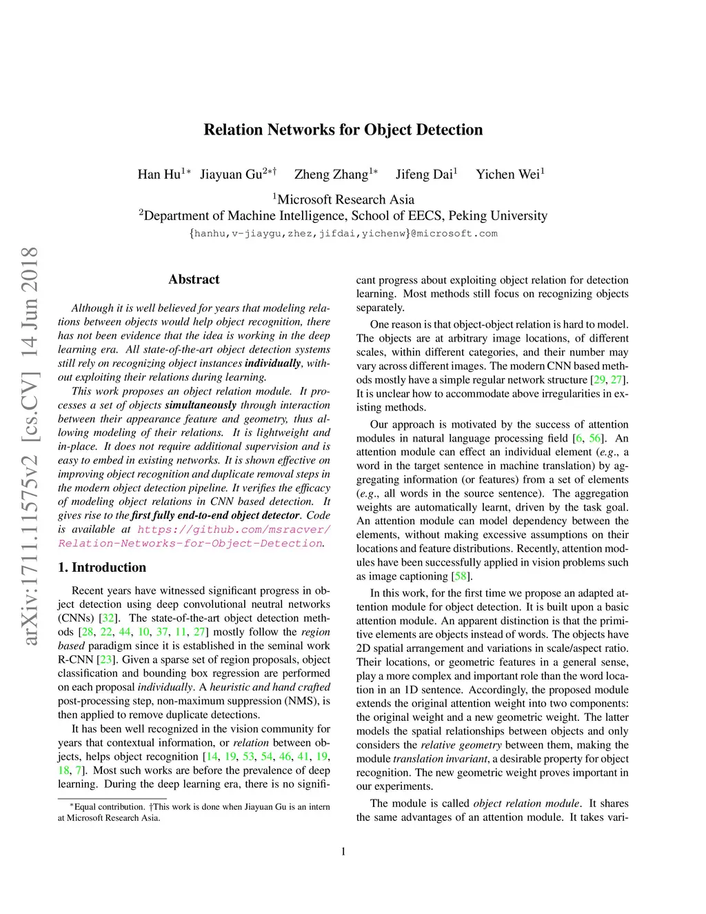 Although it is well believed for years that modeling relations between objects would help object recognition, there has not been evidence that the idea is working in the deep learning era. All state-of-the-art object detection systems still rely on recognizing object instances individually, without exploiting their relations during learning. This work proposes an object relation module. It processes a set of objects simultaneously through interaction between their appearance feature and geometry, thus allowing modeling of their relations. It is lightweight and in-place. It does not require additional supervision and is easy to embed in existing networks. It is shown effective on improving object recognition and duplicate removal steps in the modern object detection pipeline. It verifies the efficacy of modeling object relations in CNN based detection. It gives rise to the first fully end-to-end object detector.